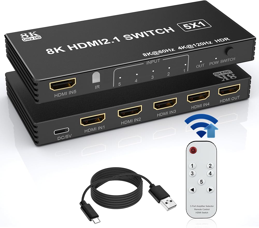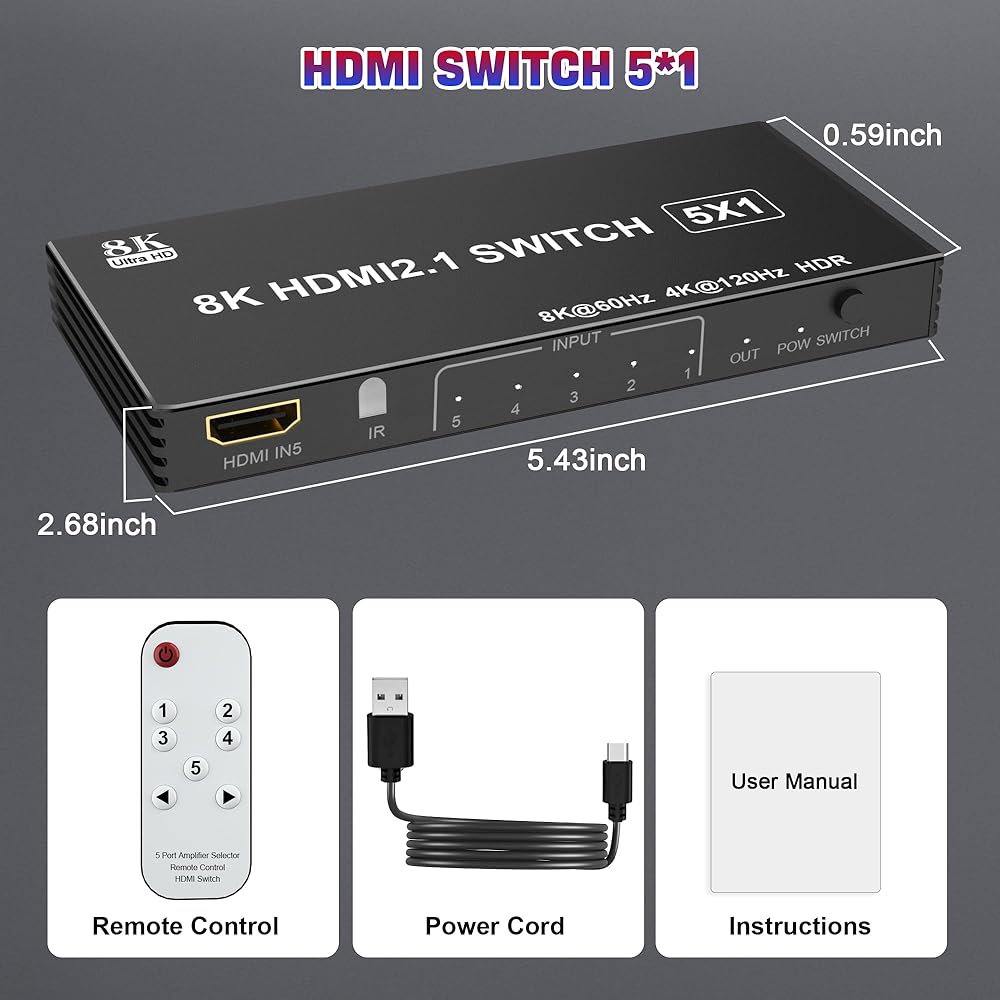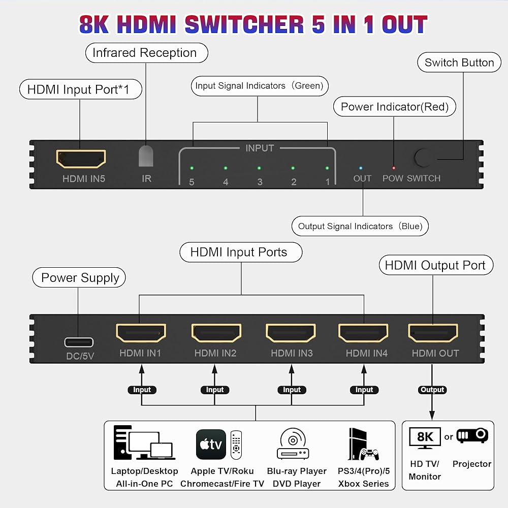 محول HDMI 4K 120 هرتز 8K HDMI 2.1 مقسم مع جهاز تحكم عن بعد - محور HDMI 5 في 1 لمدخلات متعددة، محول موسع منفذ HDMI متعدد المنافذ يدعم 8K@60 هرتز/4K@120 هرتز لجهاز PS5 Xbox DVD Player TV PC