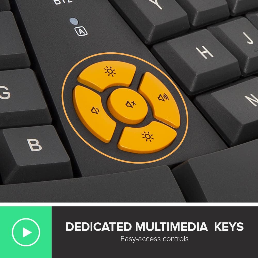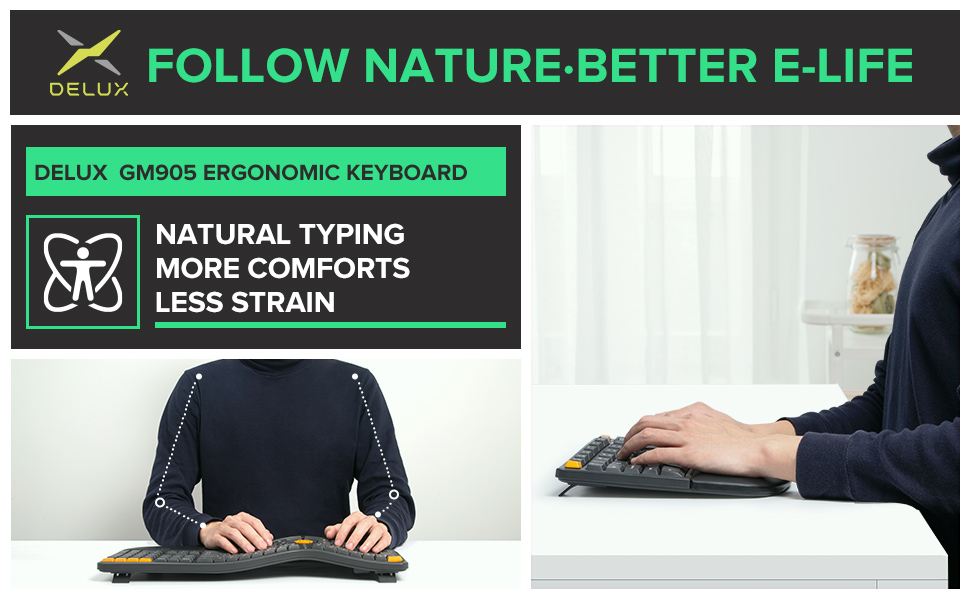 [تحقيق وضعية كتابة طبيعية مع تصميم مريح] تتبع لوحة المفاتيح الخاصة بنا الوضع الطبيعي ليديك لتعزيز زاوية مريحة أثناء الكتابة. يساعد الهيكل المنحني والمنقسم على تقليل الضغط على يديك ومعصميك وكتفيك.