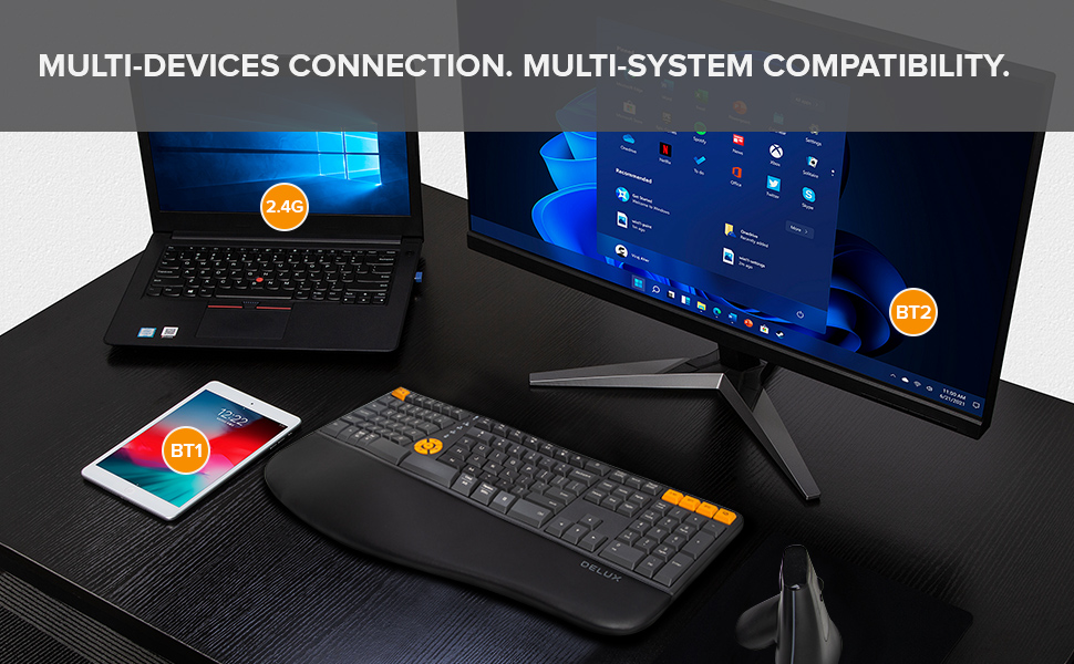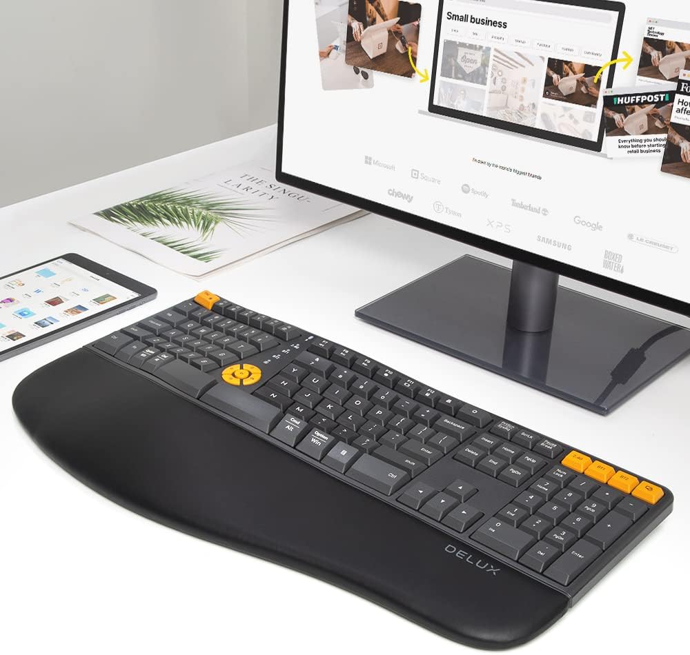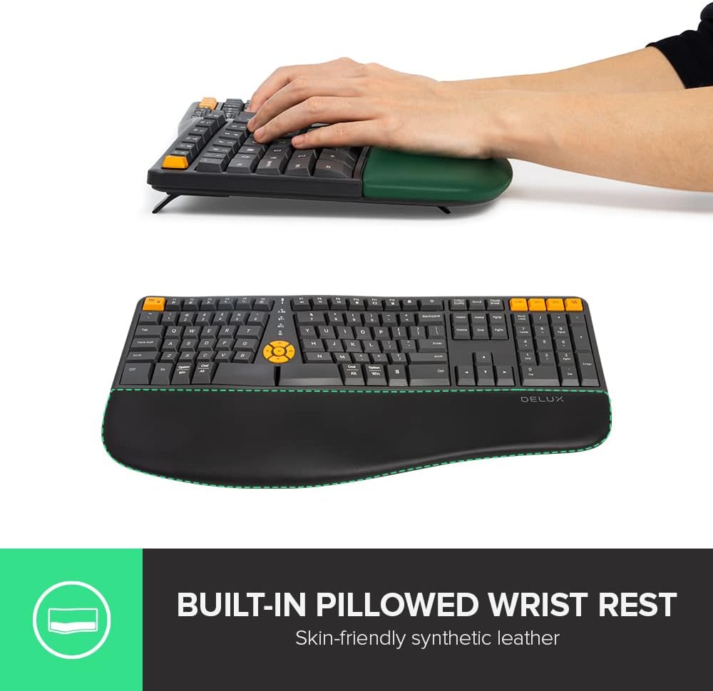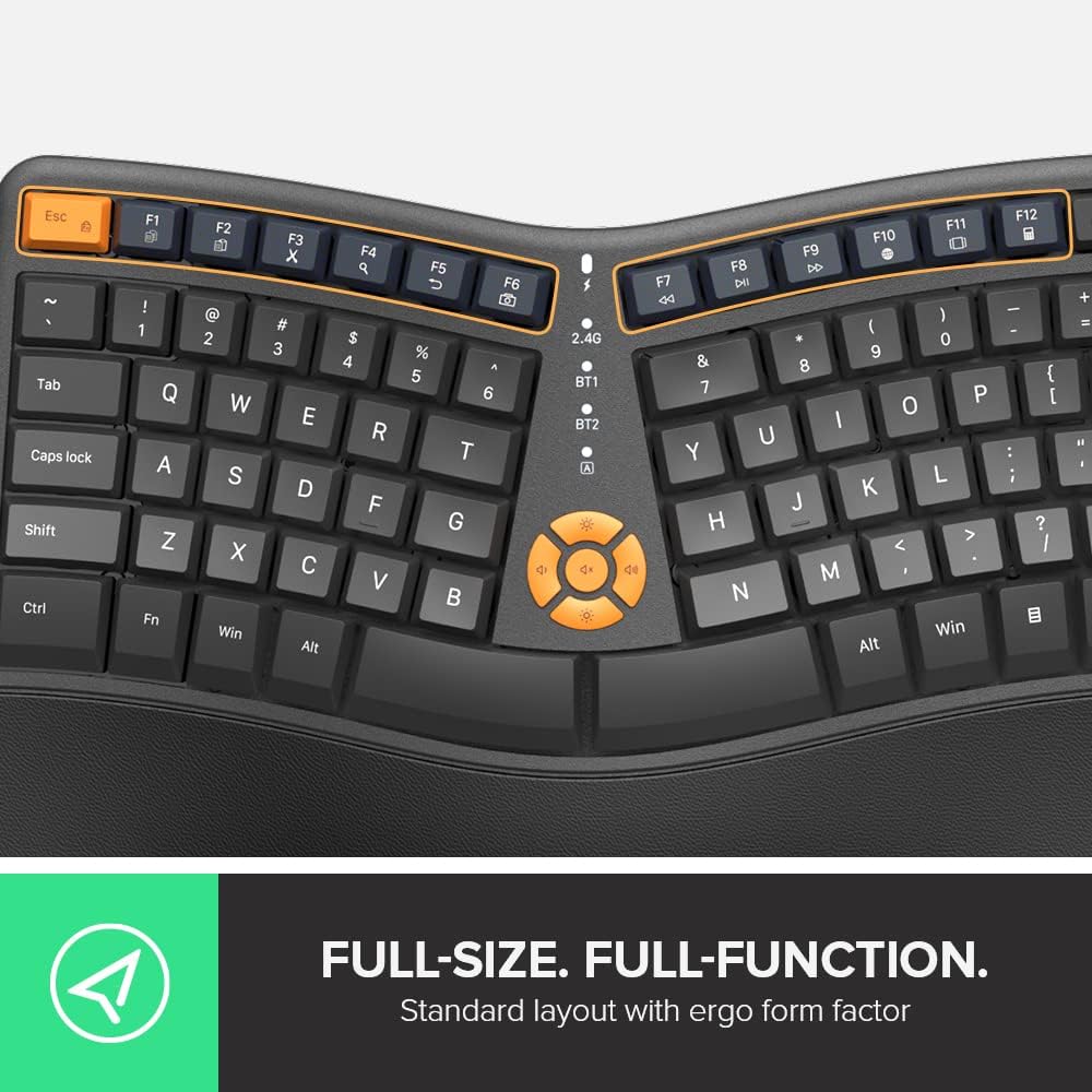 لوحة مفاتيح DeLUX اللاسلكية المريحة - لوحة مفاتيح Ergo Split مع مسند راحة اليد للكتابة الطبيعية، 2.4G وبلوتوث، حجم كامل، تصميم أمريكي - متوافق مع نظام التشغيل Windows وMac (GM905، Graphite)