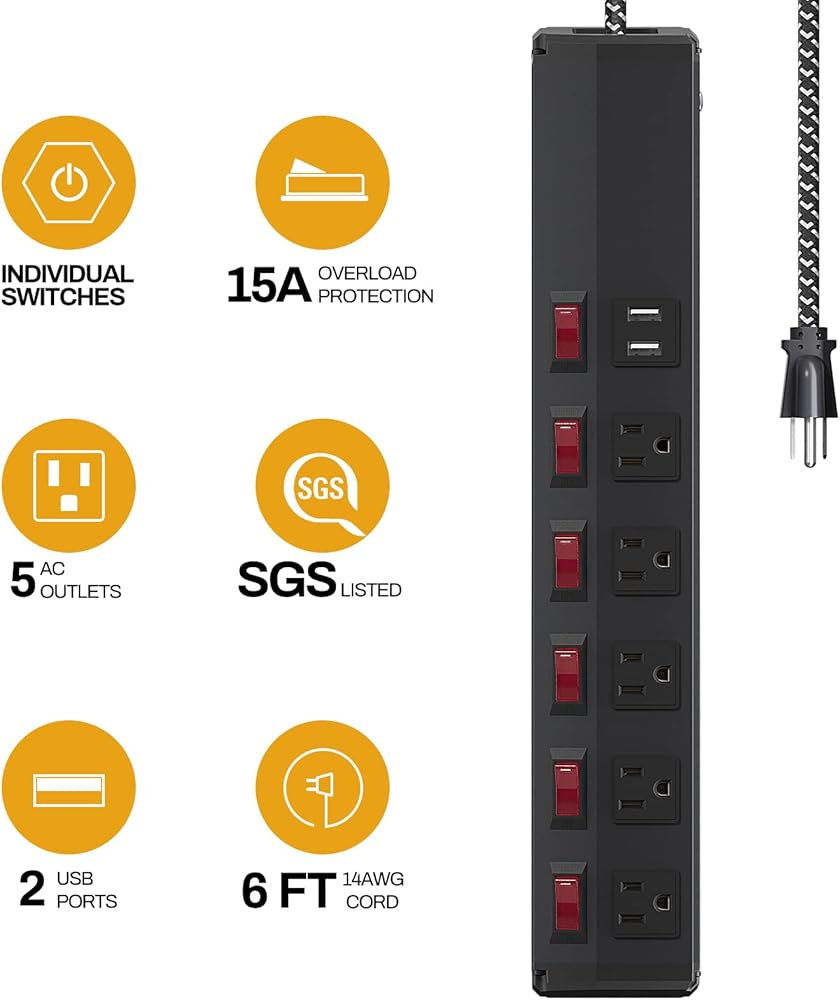 شريط طاقة مع مفتاح فردي، 5 منافذ ومنفذي USB، حماية من الحمل الزائد 15 أمبير، شريط طاقة عالي التحمل مع سلك طاقة 6 أقدام 14AWG، متعدد الوظائف لمرآب ورشة عمل حوض السمك
