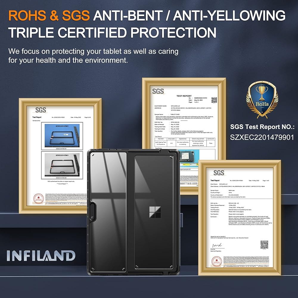 • 💎【أظهر الجمال الأصلي للكمبيوتر اللوحي بنسبة 100% وقم بتخصيص جراب الطراز الخاص بك】تعتمد حافظات سلسلة INFILAND الشفافة الكريستالية مواد Rohs الألمانية المستوردة، وقد اجتازت العديد من اختبارات السقوط من الدرجة العسكرية مع MIL-STD-810H، وصلابة الظهر 4 مرات أعلى من غيرها من الحالات الواضحة العادية. لا خوف من أي مقاومة للصدمات على الظهر. إنه يحمي جهازك اللوحي Surface pro 8 بالإضافة إلى العناية بصحتك وبيئتك. بالإضافة إلى ذلك، فهو يُظهر الجمال الأصلي للجهاز اللوحي ويسمح بتخصيص الجزء الخلفي باستخدام الملصقات الخاصة بك.