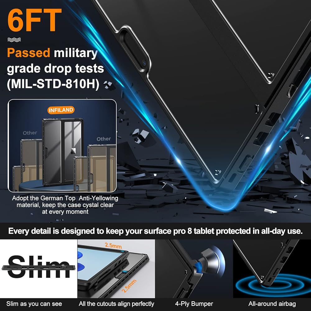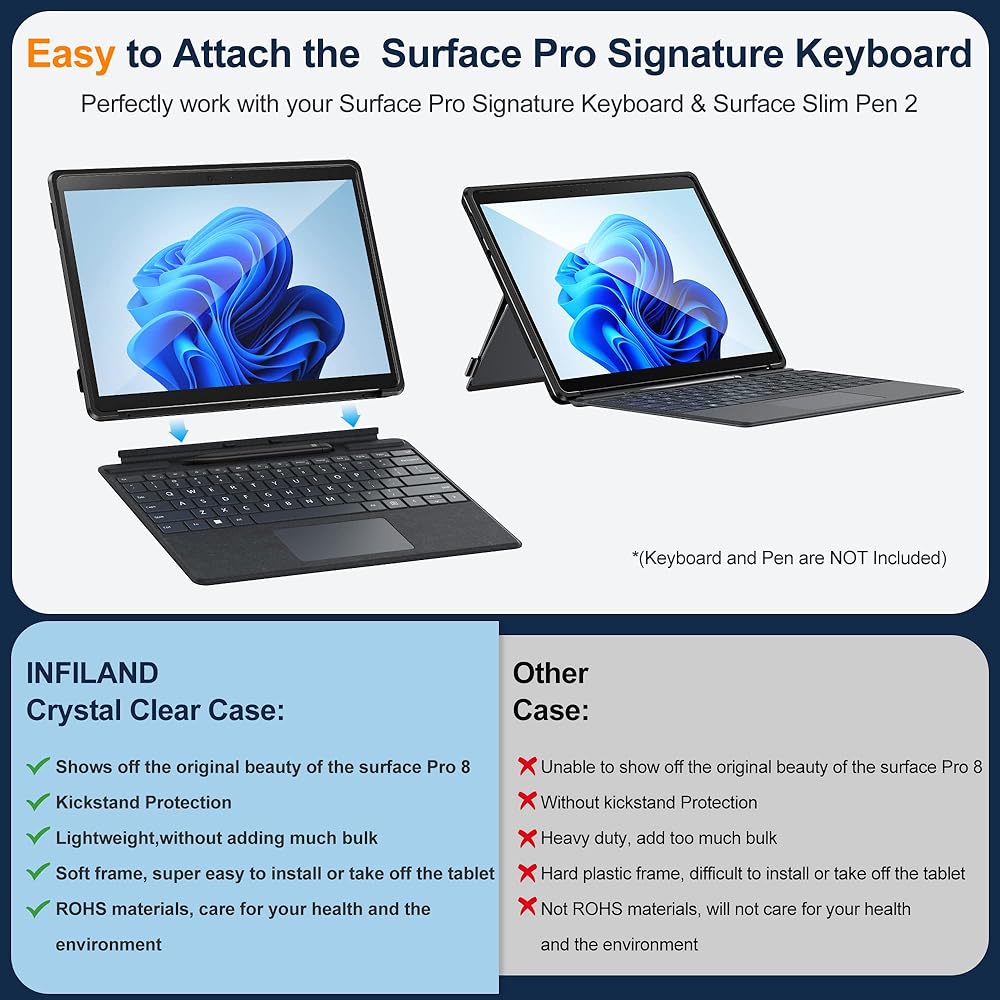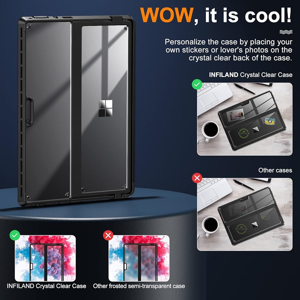 حافظة INFILAND Surface Pro 8، غطاء كريستالي شفاف متعدد الزوايا مقاوم للصدمات متوافق مع جهاز Microsoft Surface Pro 8 مقاس 13 بوصة 2021، يعمل مع لوحة مفاتيح Surface Pro Signature وقلم Surface Slim 2، أسود