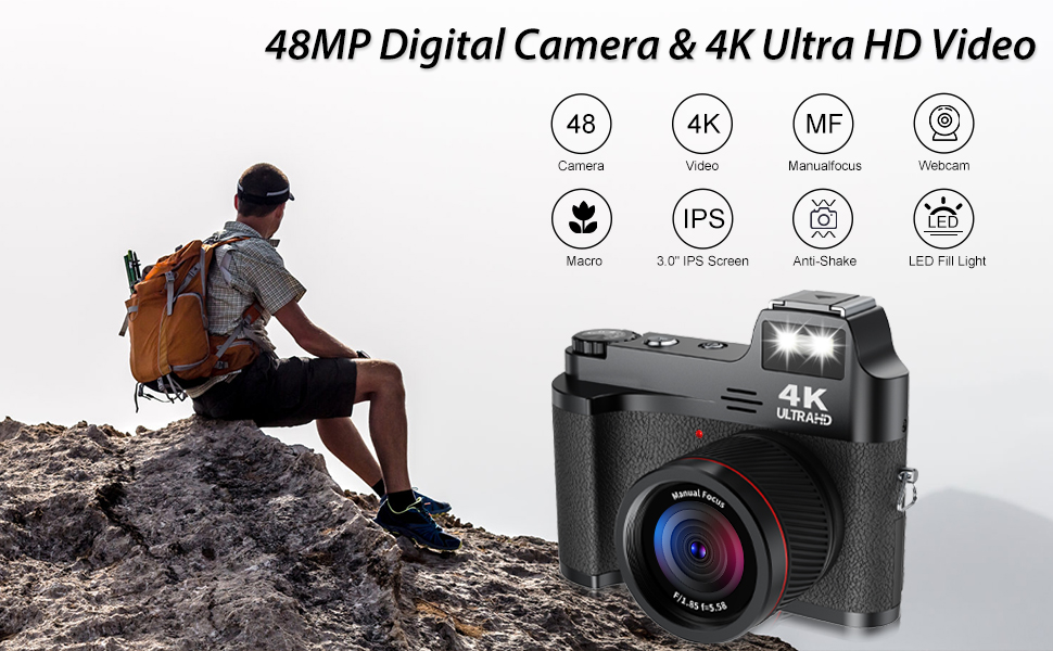 • Ultra HD 4K Video & 48MP Digital Camera The digital camera 4K takes 48MP images and record 4K videos. Large 3 inch (480X640) IPS screen that you can see what you are filming or playback immediately. The 4K digital camera also has multiple powerful features, like selfie, continuous shooting, video pause function, time lapse recording, slow-motion and recording while charging.