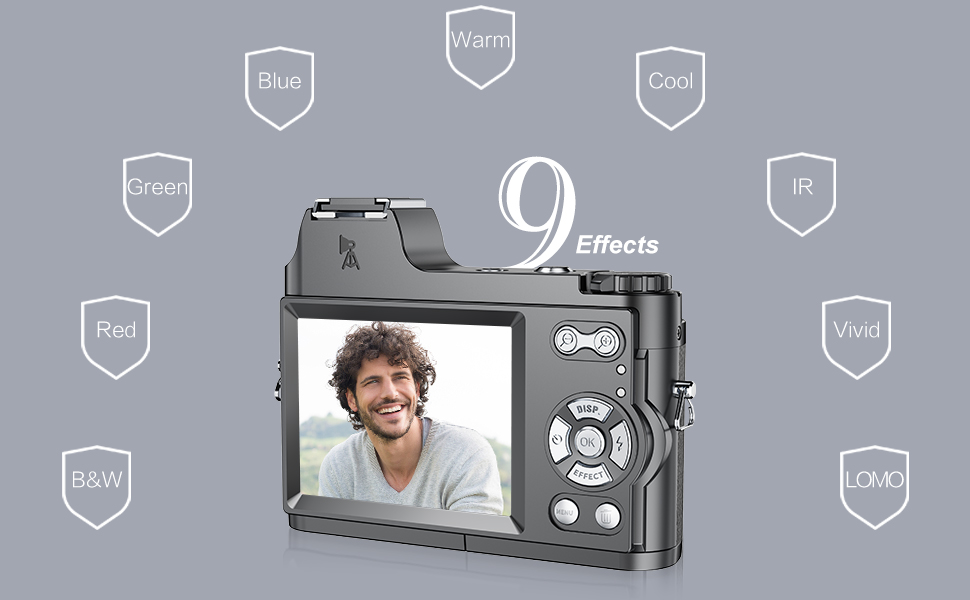 • Powerful Photography Effects This point and shoot camera comes with many photography effects, such as: B&W,Sepia,Red, Green,Blue,Sunset,Warm, Cool,Over Exposure,IR, Binary ,Vivid,Undertone,Dog Eye,Aibao,Gothic,Japan Style,LOMO,Negative.