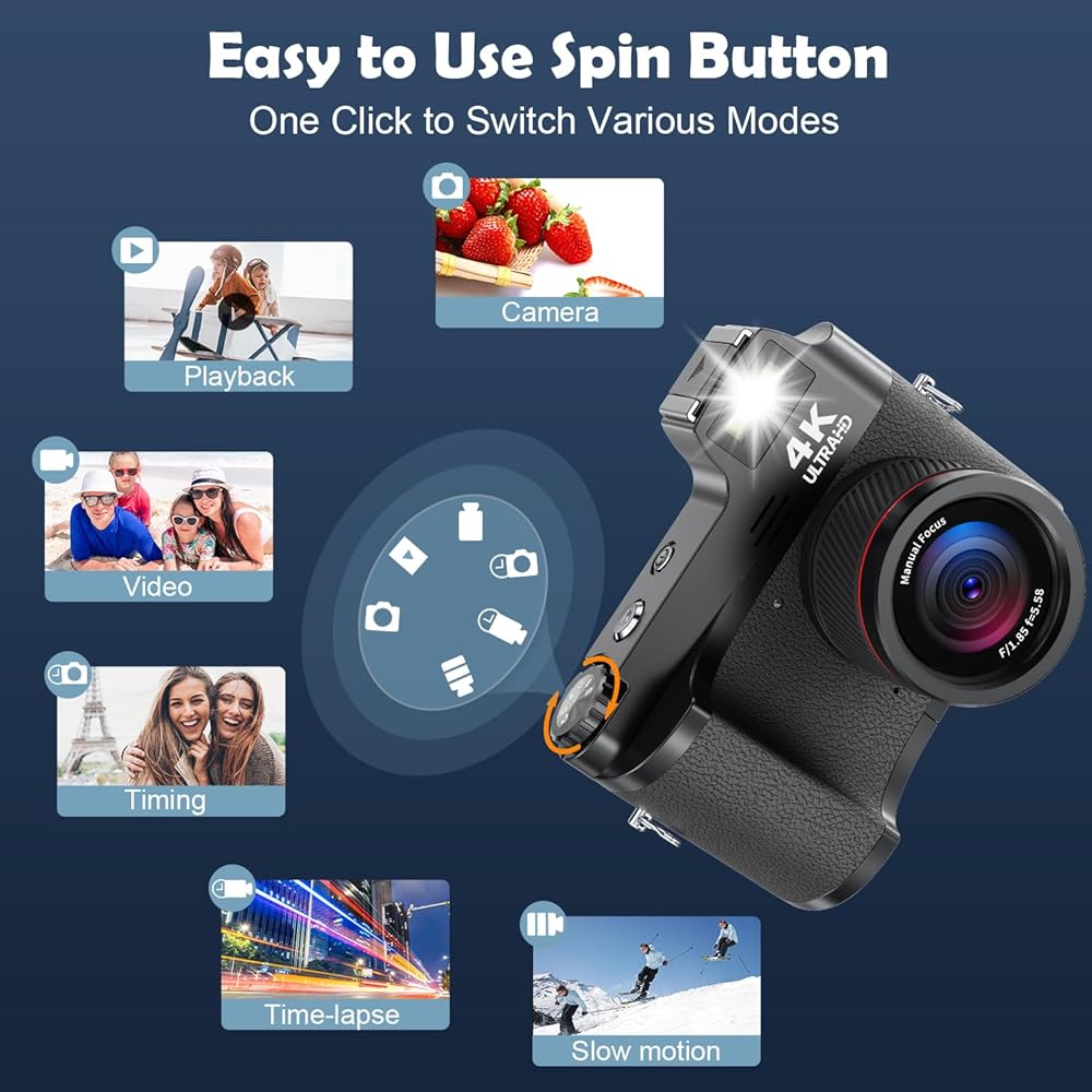 كاميرا Vmotal الرقمية 4K، كاميرا فيديو 4K بدقة 48 ميجابكسل، شاشة IPS 3 بوصة/تكبير 18x/فاصل زمني/حركة بطيئة/تركيز تلقائي/تركيز يدوي/فلاش/قرص، كاميرا تسجيل فيديو لليوتيوب