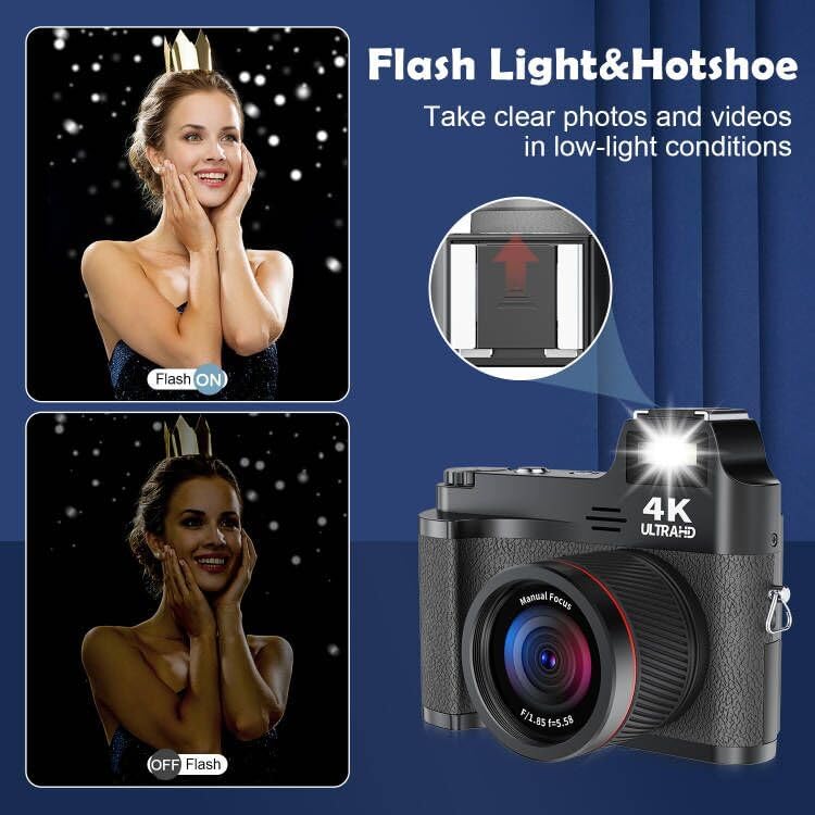 • 4K Digital Camera with Manual Focus This 4K camera has macro function, which can magnify nearby subject for close-up photos, which show the suprise of the tiny world. You can take pictures of flowers, insects, small objects in close-up photography with this small camera. And also it is fun with manual focus function to take the beautiful prospect scenes, view big and wide world!
