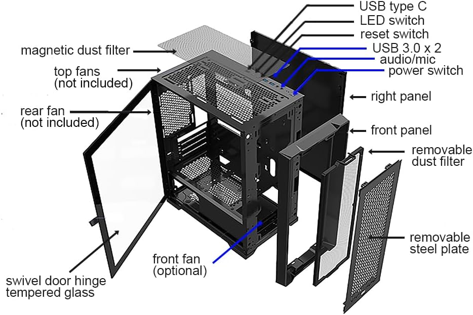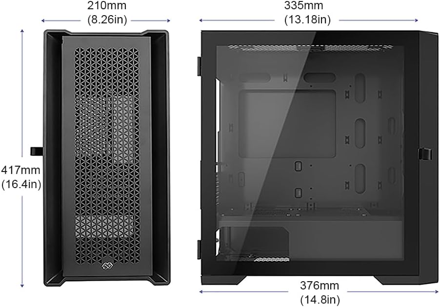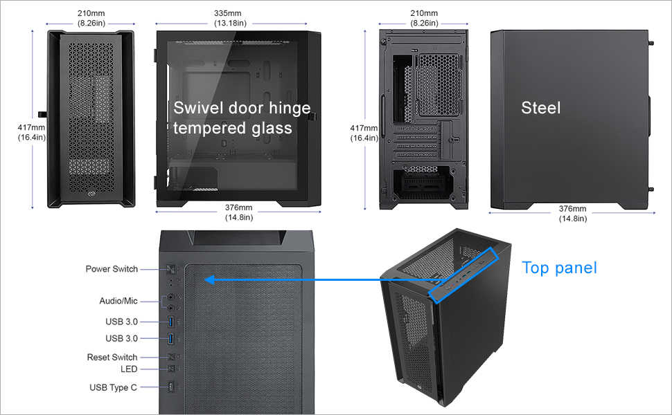 • تدفق هواء هائل مع لوحة أمامية شبكية فولاذية قابلة للإزالة وفلتر غبار مغناطيسي أمامي وعلوي قابل للغسل.