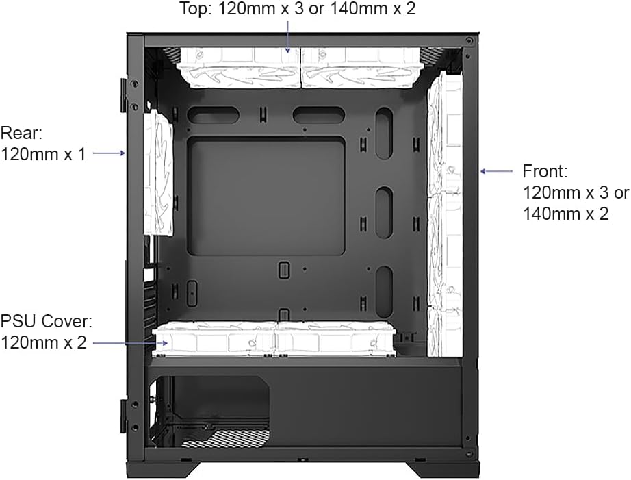 • تصميم نظام تدفق الهواء الرائع من برستيج لتبريد فائق.. يدعم ما يصل إلى 8 مراوح. يدعم مبرد تبريد الماء حتى 240 ملم. يدعم مصدر طاقة ايه تي اكس حتى عمق 180 ملم. يدعم اللوحات الأم مايكرو ايه تي اكس واي تي اكس.