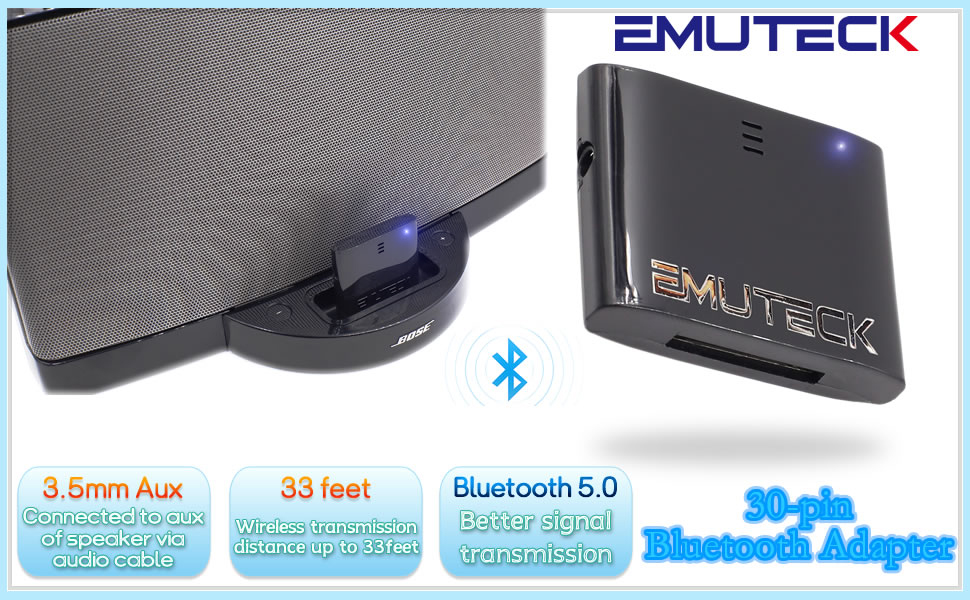 EMUTECK 30 Pin Bluetooth 5.0 محول ستيريو لجهاز Bose SoundDock 2 ومكبرات الصوت الأخرى ذات 30 دبوسًا، مع كابل Aux 3.5 مم، لمحطات إرساء موسيقى iPhone iPod (ليس للسيارات)