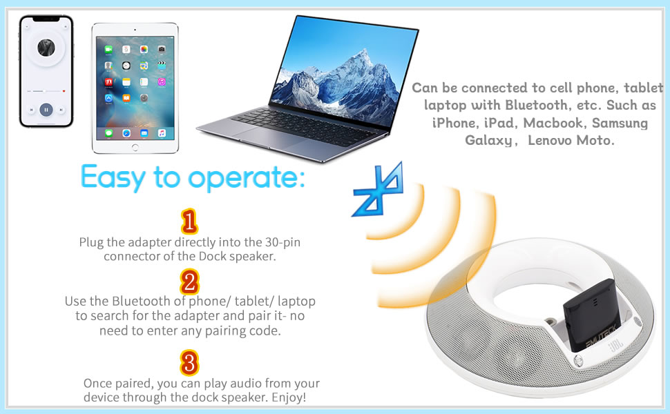 ✍ تم تمكين تقنية Bluetooth لمكبرات الصوت Dock ذات 30 سنًا: بالنسبة للسماعات القديمة المزودة بموصل Dock ذو 30 سنًا، لا تتمتع بقدرات لاسلكية. يعمل محول مستقبل البلوتوث هذا على حل هذه المشكلة عن طريق توصيل جهاز الاستقبال ببساطة بموصل القاعدة ذو 30 سنًا الموجود على مكبر الصوت، وإقران جهاز البلوتوث الخاص بك (مثل الهاتف والكمبيوتر اللوحي وiPhone وiPad وiPod) مع جهاز الاستقبال، ثم يمكنك بث البث الخاص بك موسيقى ستيريو لاسلكيًا إلى السماعة، سهلة الاستخدام.