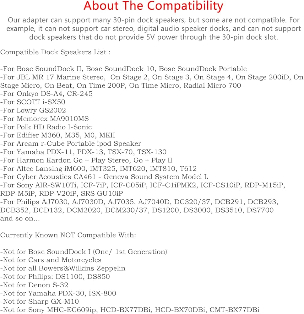 ✍ التوافق: يرجى التأكد من أن مكبر الصوت الخاص بك يحتوي على موصل 30 سنًا قبل استخدام هذا المحول. وهو متوافق مع Bose SoundDock II وSCOTT وJBL وHarman Kardon ومكبرات الصوت الأخرى. ومع ذلك، يرجى ملاحظة أنه لا يمكن أن يعمل مع نظام الصوت الاستريو للسيارة والدراجات النارية، غير مناسب لـ Bose SoundDock I، Bowers&Wilkins Zeppelin، أو Philips DS1100 بسبب قيود الطاقة والبروتوكول.