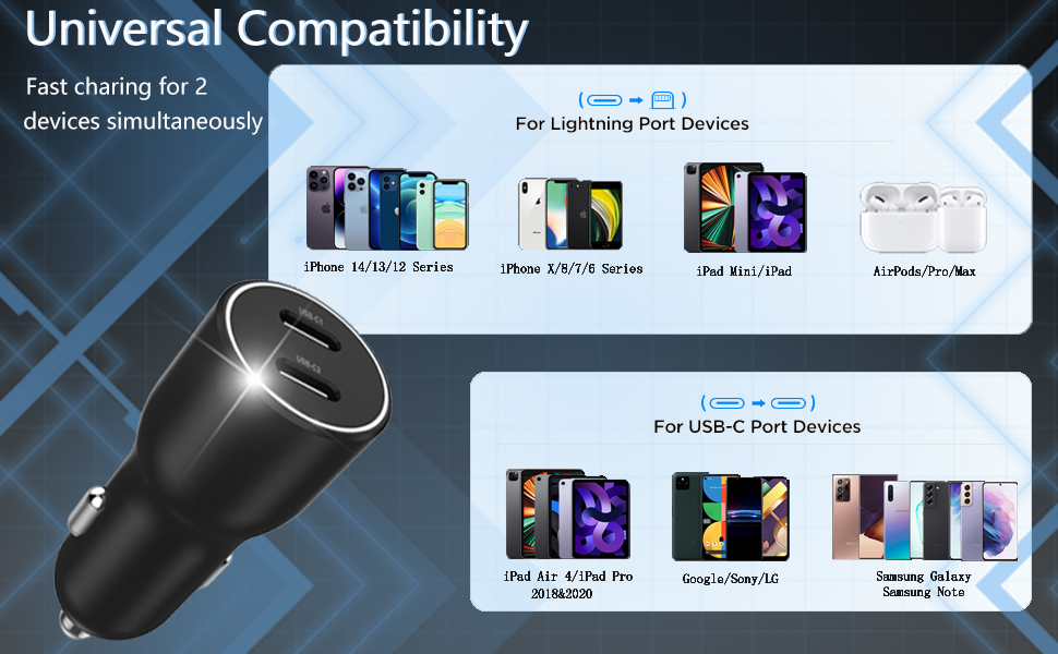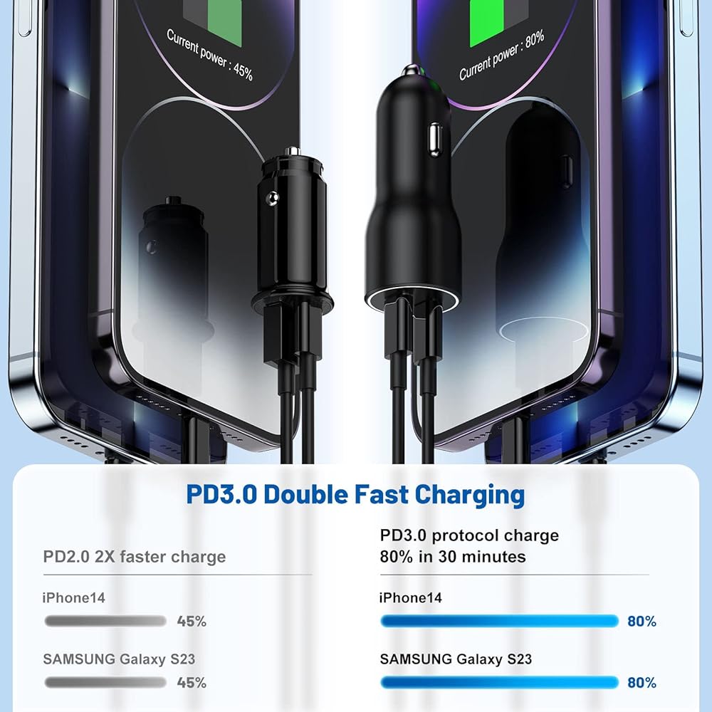 ✅[شحن فعال 4.5 أمبير/45 وات]: مخرج PD 3.0 أحادي المنفذ 45 وات (كحد أقصى)، أسرع 3 مرات من شاحن 1 أمبير/5 وات، يحتاج فقط إلى 30 دقيقة لشحن iPhone 14 Pro max أو Samsung S22 من 0-50%. [USB-C1/C2: 5 فولت = 3 أمبير، 9 فولت = 3 أمبير، 12 فولت = 3 أمبير، 15 فولت = 3 أمبير، 20 فولت = 2.25 أمبير. USB-C1+C2: 20W+20W(5V=2.4A,9V=2.2A,12V=1.67A)] تصميم ذكي بمنفذ USB مزدوج، يتعرف بشكل فعال على جهازك ويشحن الأجهزة المزدوجة بأمان بأقصى سرعة في نفس الوقت من فضلك ملحوظة: شاحن السيارة USB هو شاحن سيارة مزدوج بمنفذ USB-C، ولكنه ليس شاحن PD USB-A Lighter.