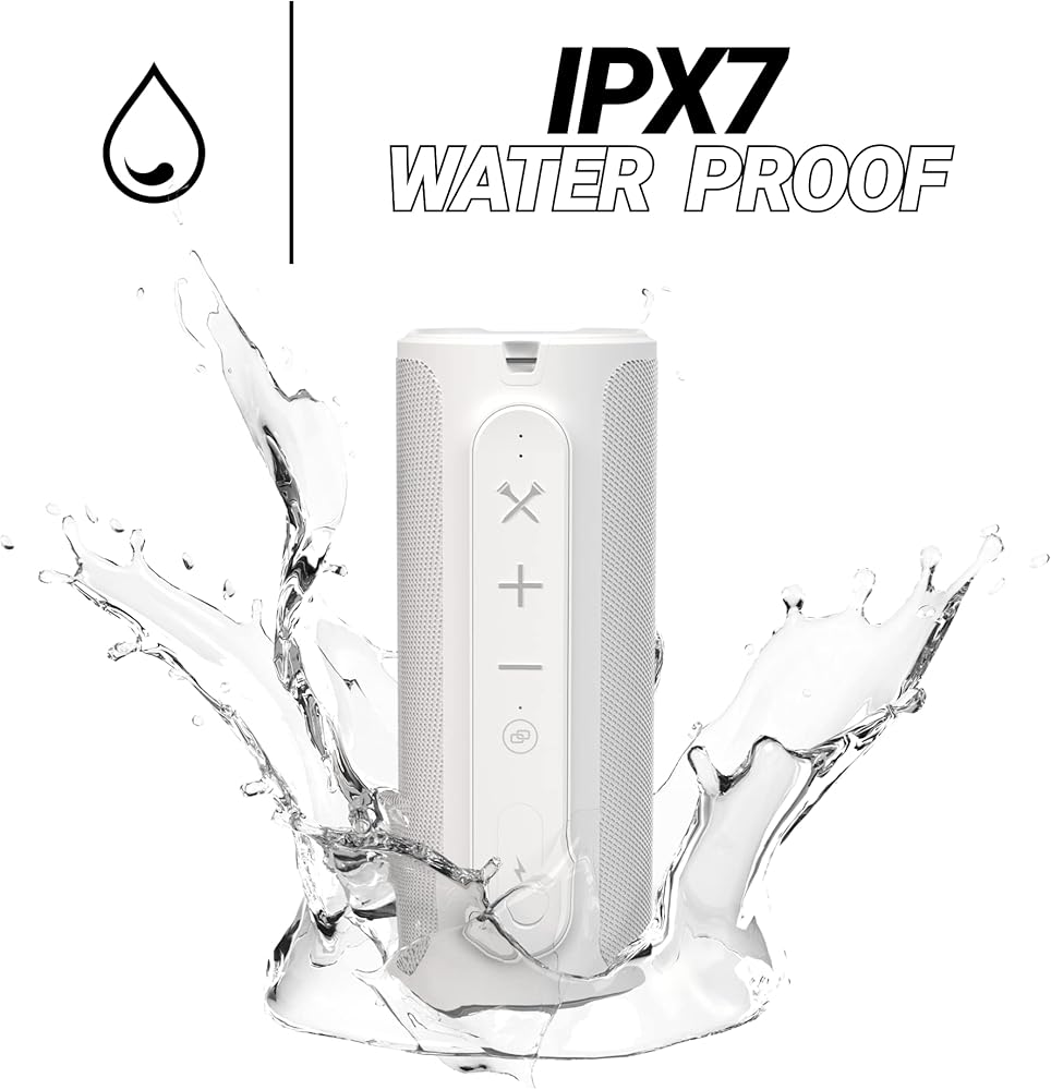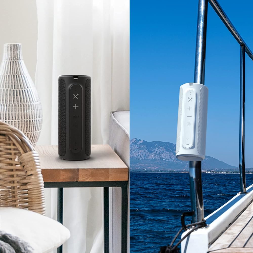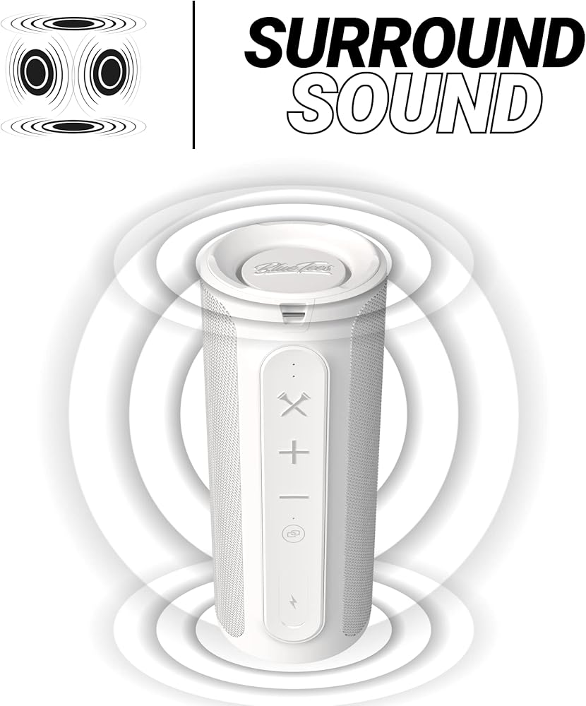 نظرة عامة على المزايا - مغناطيس قوي، بلوتوث 5، مقاومة للماء IPX 7، صوت فائق، نطاق 100 قدم، بلوتوث 5، عمر بطارية 12+ ساعة، مكبر صوت، اقتران تي دبليو اس - اقتران مكبر صوت مزدوج، اقتران سريع ان اف سي، شحن USB C، الوضع الداخلي والخارجي.