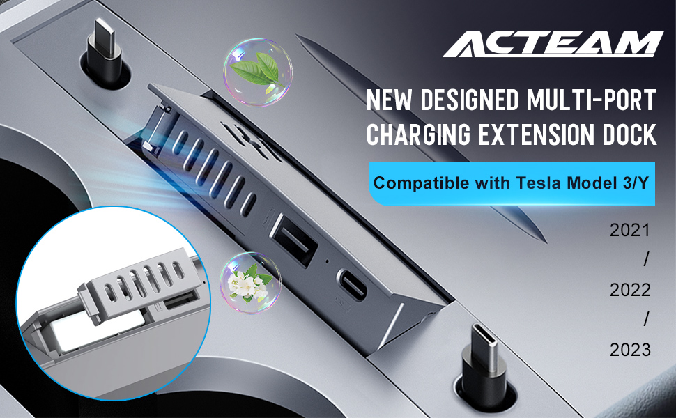 قاعدة شحن متوافقة مع موزع USB من تيسلا مع كابلات شحن قابلة للسحب والعلاج العطري ووحدة التحكم المركزية لسيارة تسلا موديل 3/Y 2021 2022 2023