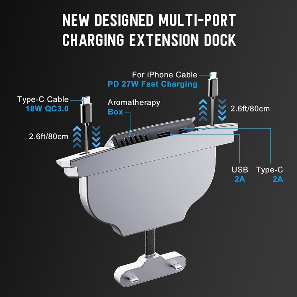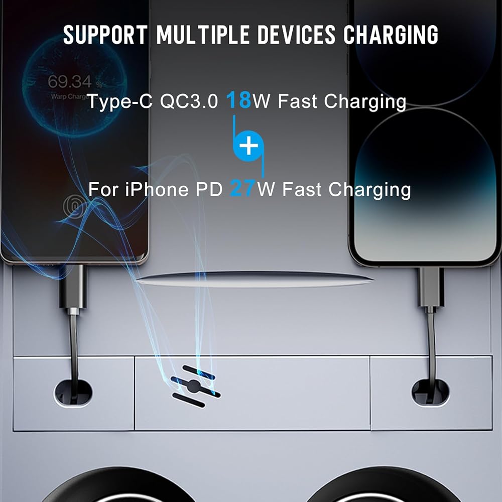 • 【منافذ متعددة وكيبلات قابلة للسحب】يحتوي موزع USB هذا على 2 كيبل شحن سريع، مع كيبل شحن سريع 27 واط لموبايل ايفون وكابل بيانات سريع 18 واط من النوع سي. كما أنه يوفر لك منفذ USB-A ومنفذ من النوع C حتى تتمكن من الاستمتاع برحلتك في السيارة مع عائلتك وأصدقائك.