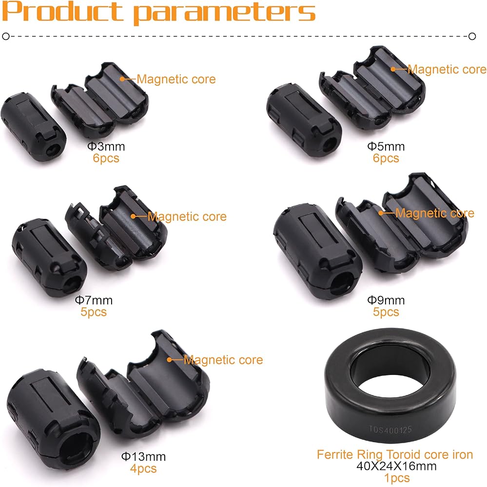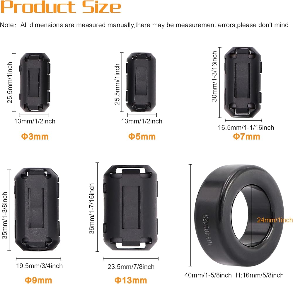 المقاس: مع 5 مقاسات مختلفة بقطر داخلي 3/ 5/ 7/ 9/ 13 ملم؛ حلقة الفريت من الحديد الحلقي 40 × 24 × 16 ملم.