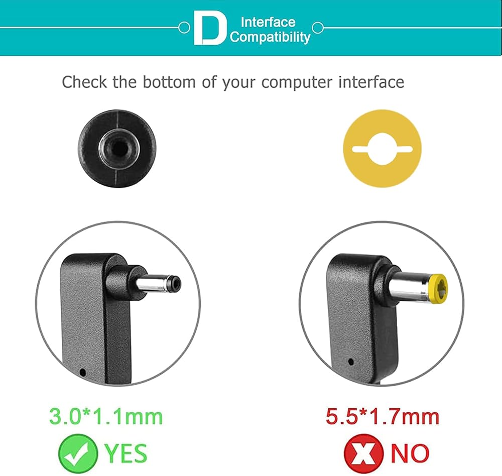 • ADP-45FE F ADP-45HE PA-1450-26 تحتوي هذه الطرازات على حجمين للموصل. واحد هو 5.5*1.7 مللي متر ، والآخر 3.0*1.1 مللي متر. حجم موصل المحول هذا هو 3.0*1.1 مللي متر. وهو أصغر من 5.5*1.7 مللي متر (يرجى التحقق من صور حجم الموصل الثالث). قبل شرائه، يرجى التحقق من حجم موصل المحول الأصلي الخاص بك !!!!!!