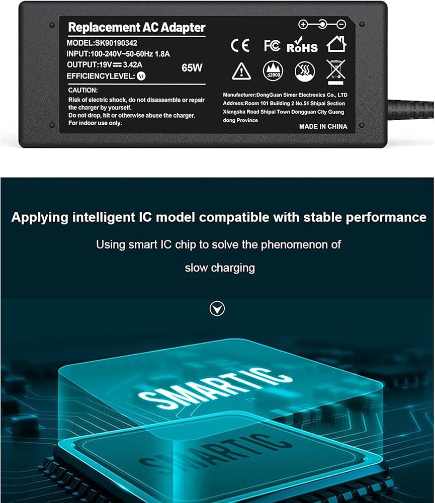 • المواصفات - الإدخال: 100-240 فولت ~ 1.5 أمبير 50-60 هرتز، الإخراج: 19 فولت/3.42 أمبير، مصدر الطاقة: 65 وات، الموصل: 3.0*1.1 مم.
