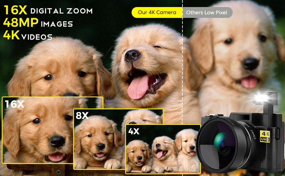 [كاميرا رقمية وكاميرا فيديو 4K] تعتمد هذه الكاميرا الرقمية V-Cam مستشعر SONY، مزدوج ككاميرا تصوير فوتوغرافي وكاميرا فيديو، وتلتقط صورًا واضحة تصل إلى 48 ميجابكسل ودقة فيديو تصل إلى 4K. دعم التكبير الرقمي 16X. إنه ضبط تلقائي للصورة، وتتبع الكائن تلقائيًا لالتقاط صور واضحة، وللتصوير عن قرب، يمكنك أيضًا الضغط على المصراع نصف ضغطة للتركيز السريع.