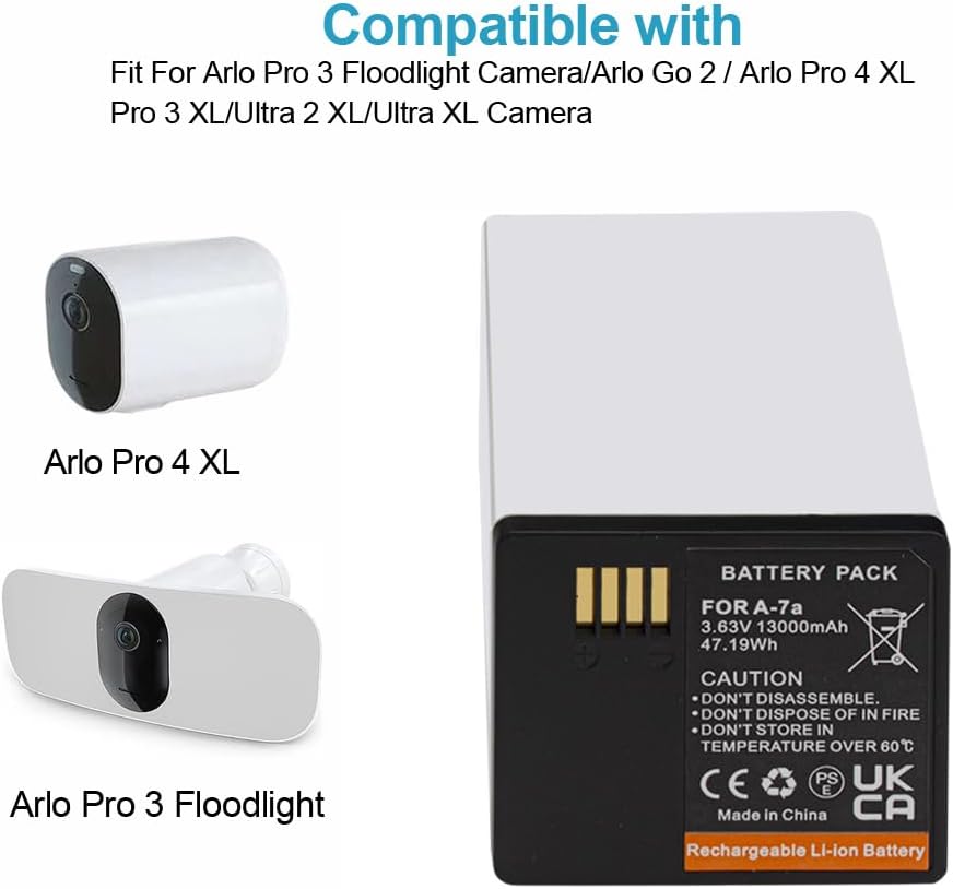 • المواصفات: نوع بطارية جيلينتو: بطارية ليثيوم أيون بديلة قابلة لإعادة الشحن من طرف ثالث؛ السعة: 3.63 فولت /47.19 وات في الساعة/ 13000 مللي أمبير في الساعة؛ بطاريات قابلة لإعادة الشحن مكونة من عبوتين بديلة لكاميرا Arlo Pro 3 XL / Arlo Go 2 / Arlo Pro 4 XL/ Pro 3 XL/ Ultra 2 XL/Ultra XL.