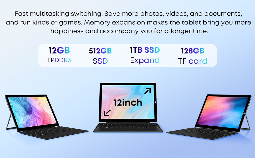 【مساحة تخزين كبيرة 12 جيجابايت + 512 جيجابايت 】احفظ المزيد من الصور ومقاطع الفيديو والمستندات، وقم بتشغيل ألعاب متعددة بسهولة باستخدام مساحة تخزين كبيرة تبلغ 12 جيجابايت LPDDR3 و512 جيجابايت SSD (أسرع 5 مرات من وحدة تخزين eMMC الأصلية). يدعم هذا الجهاز اللوحي الذي يعمل بنظام Windows توسيع مساحة تخزين بطاقة Micro SD (غير متضمنة) حتى 128 جيجابايت، ويدعم توسيع SSD حتى 1 تيرابايت. يمكنك اصطحاب العديد من ملفات الوسائط المفضلة لديك، مثل الكتب الإلكترونية ومقاطع الفيديو والصور والموسيقى وما إلى ذلك.