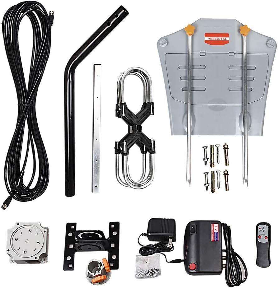 📺 محتويات العبوة، هوائي تلفزيون خارجي مع جهاز تحكم لاسلكي، ومحول إمداد الطاقة وكابل محوري بطول 33 قدمًا وعمود تثبيت، للحصول على أفضل تأثير للاستقبال.