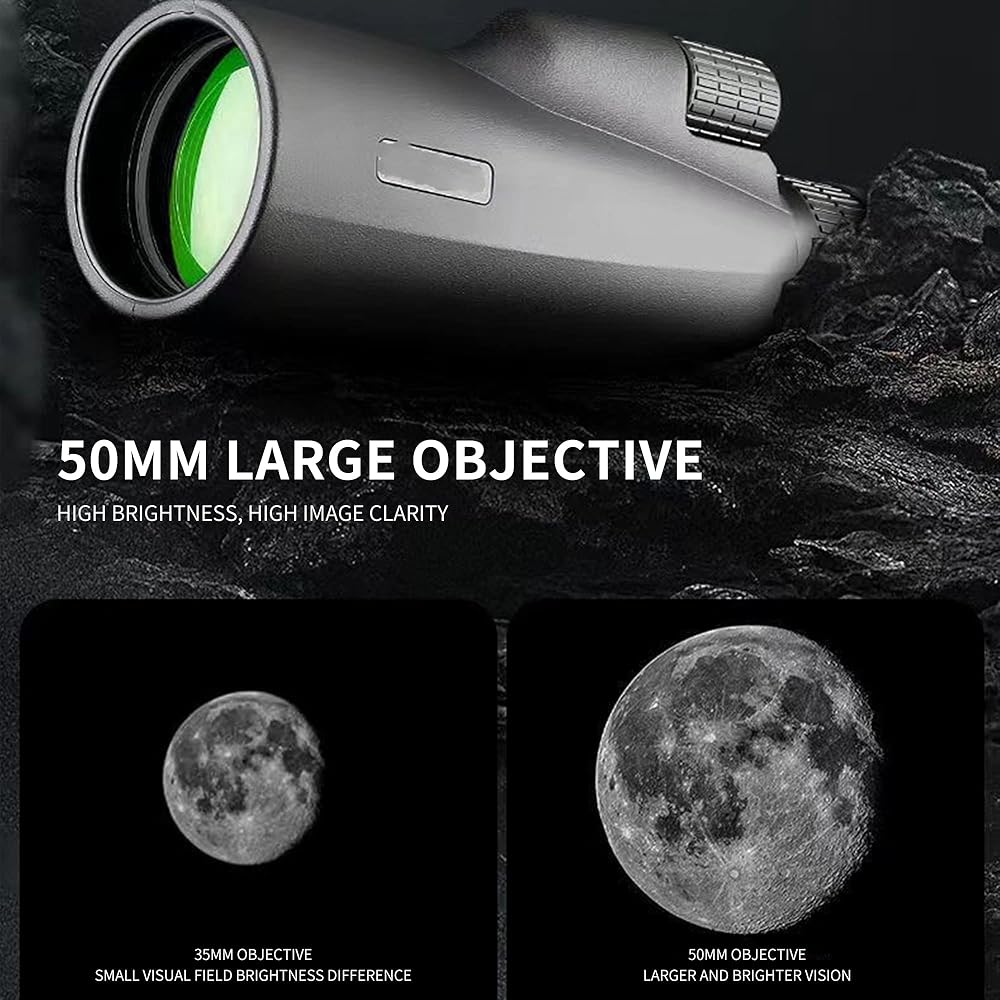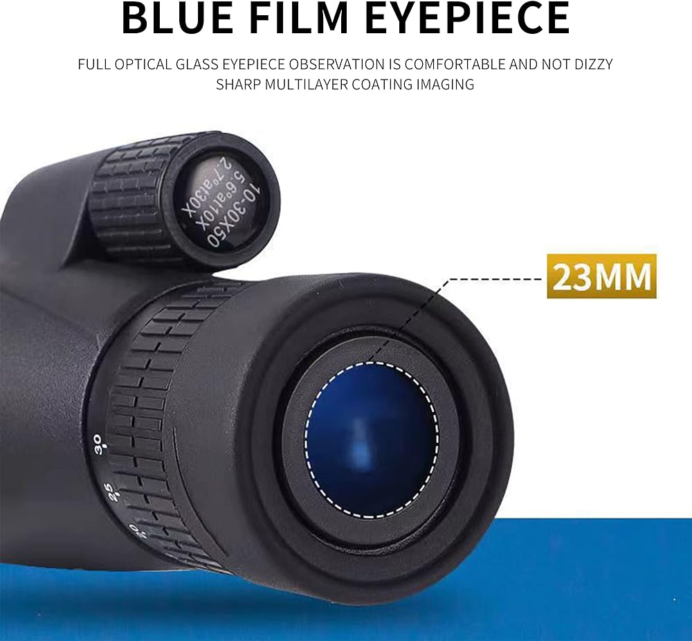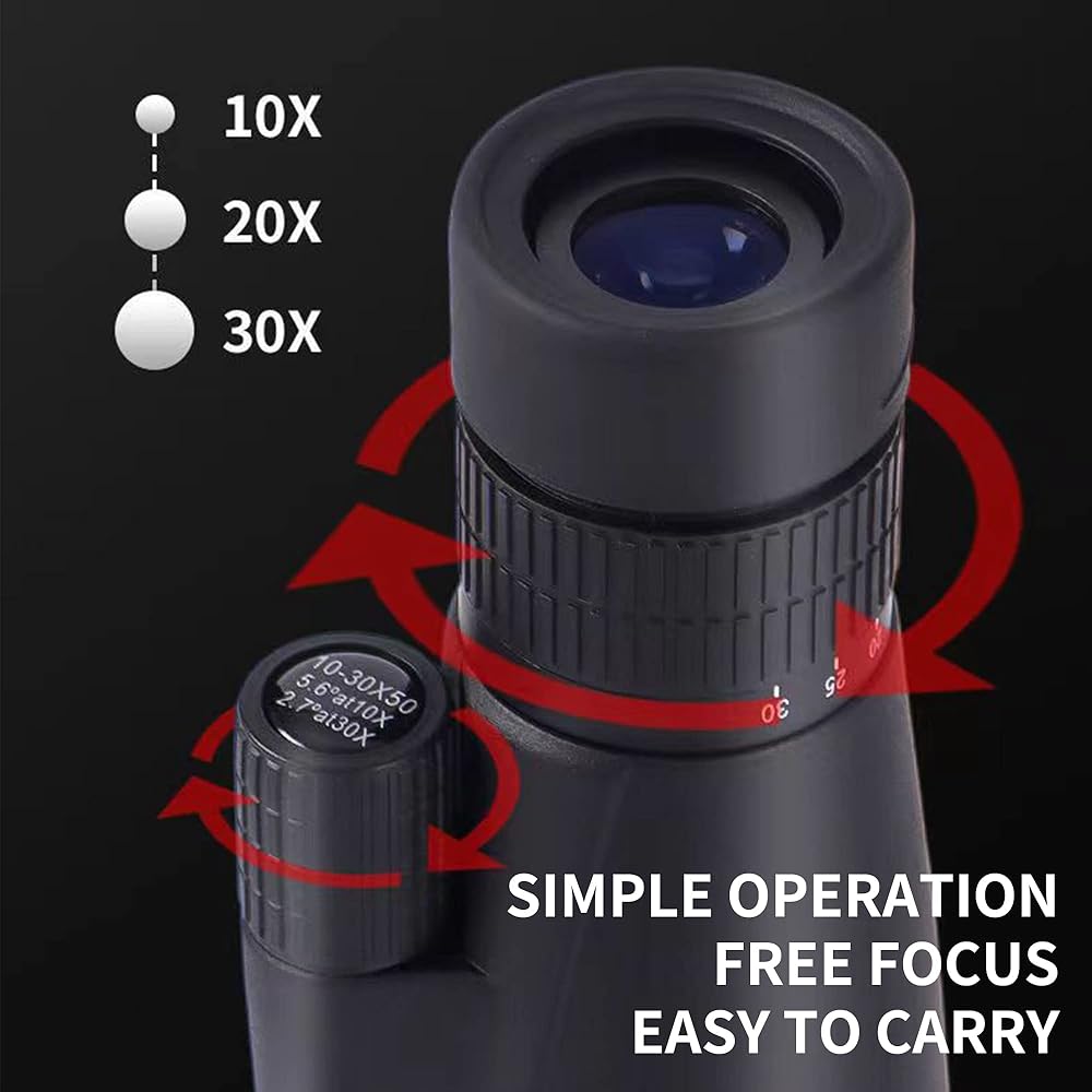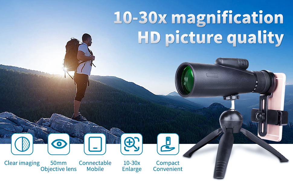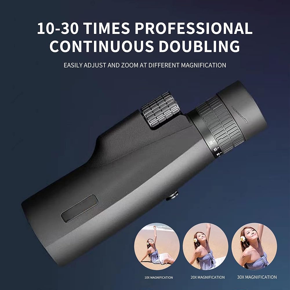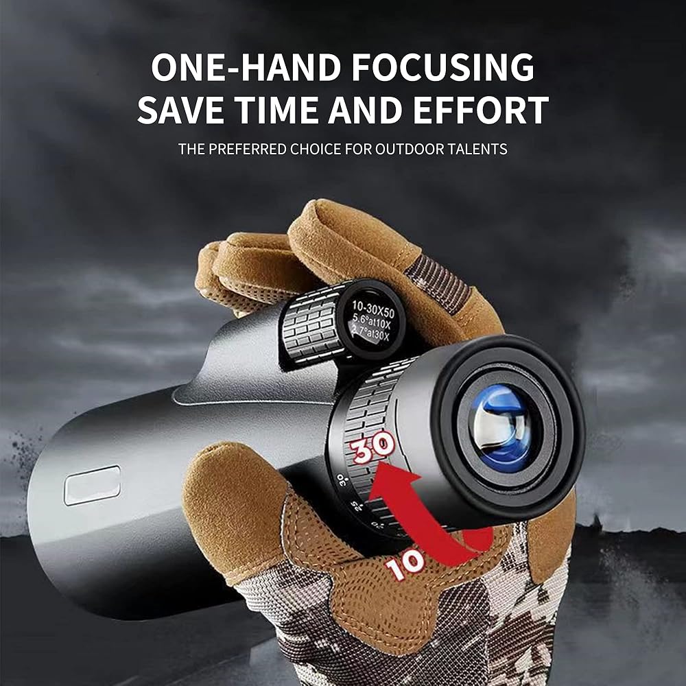 • 【30x High Power Wide Angle Monocular】Monocular telescope for adults with a 50mm objective lens, features a powerful zoom magnification range that adjustable 10x to 30x magnification, use low magnification if you need to see a larger view and handle it steady, zoom in to high magnification when you need to see something longer distance and also want a specific picture. You can clearly see the mountains 1200 yards away.