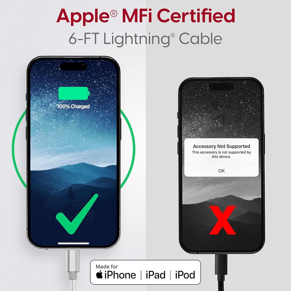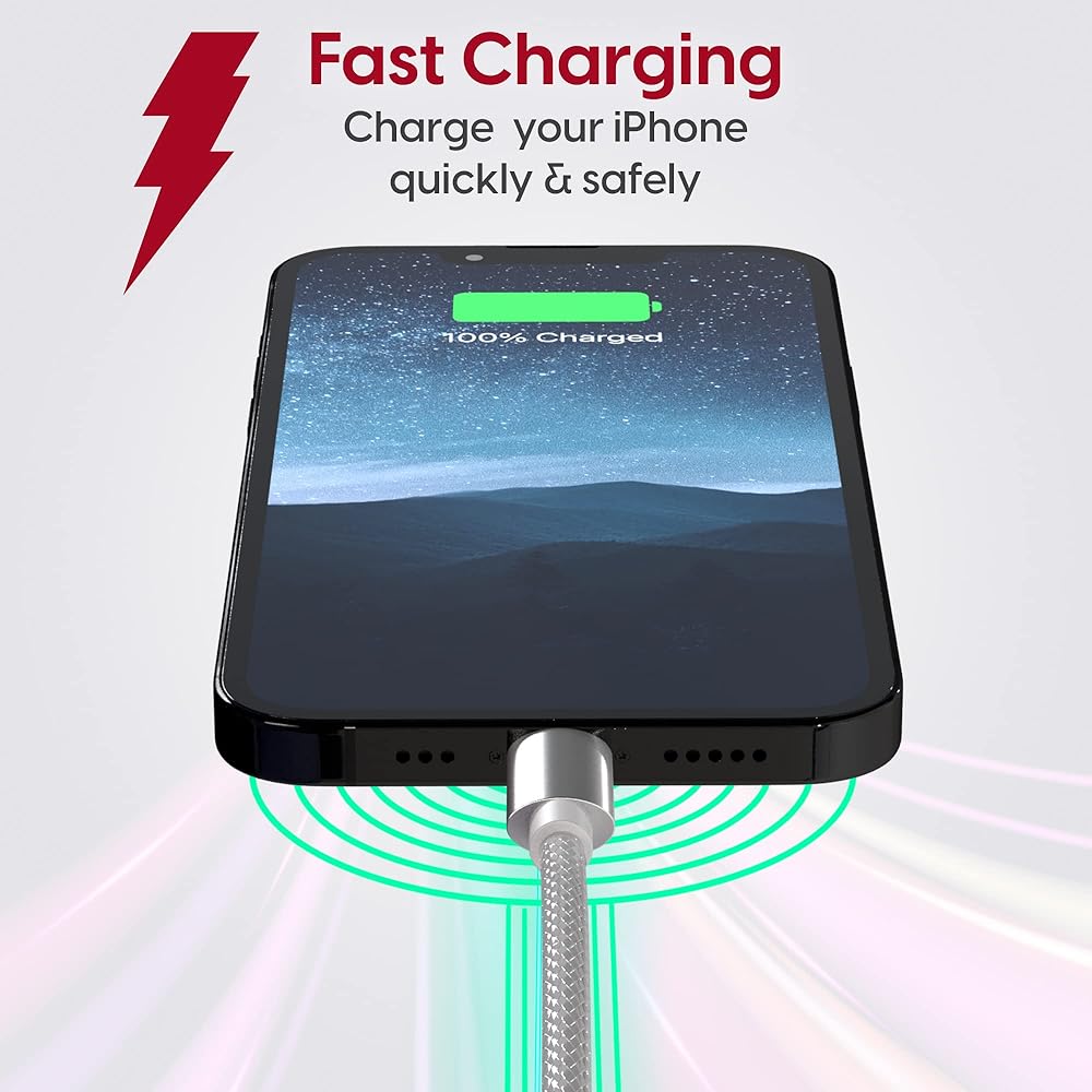 معتمد من ام اف اي: [مصنوع لأجهزة ايفون وايبود وايباد] تم تصميم كابل لايتنينج حصريًا لشاحن ابل ايفون ومعتمد من ابل ام اف اي لضمان أن ايفون 12 الجديد الخاص بك آمن من ارتفاع درجة الحرارة أو قصر الدائرة الكهربائية