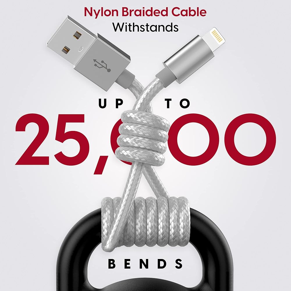 موصلات شديدة التحمل: يتميز كيبل شاحن ايفون بمفاصل توصيل فائقة القوة توفر تصميمًا لتخفيف الضغط مصنوع لتحمل ما يصل إلى 15000 انحناء مدى الحياة، مما يسمح له بتحمل قسوة الاستخدام اليومي ويدوم لفترة أطول من الكابل العادي