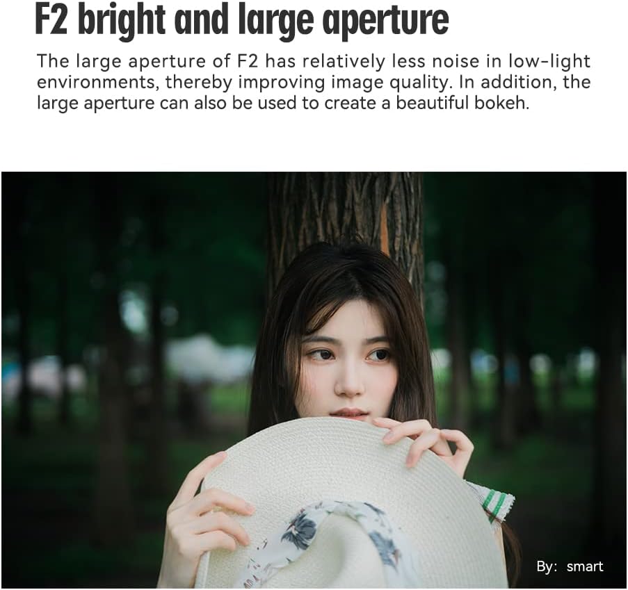 فتحة F2 ساطعة وكبيرة: تتميز الفتحة الكبيرة F2 بضوضاء أقل نسبيًا في البيئات منخفضة الإضاءة، وبالتالي تحسين جودة الصورة. بالإضافة إلى ذلك، يمكن أيضًا استخدام الفتحة الكبيرة لإنشاء تأثير بوكيه جميل.