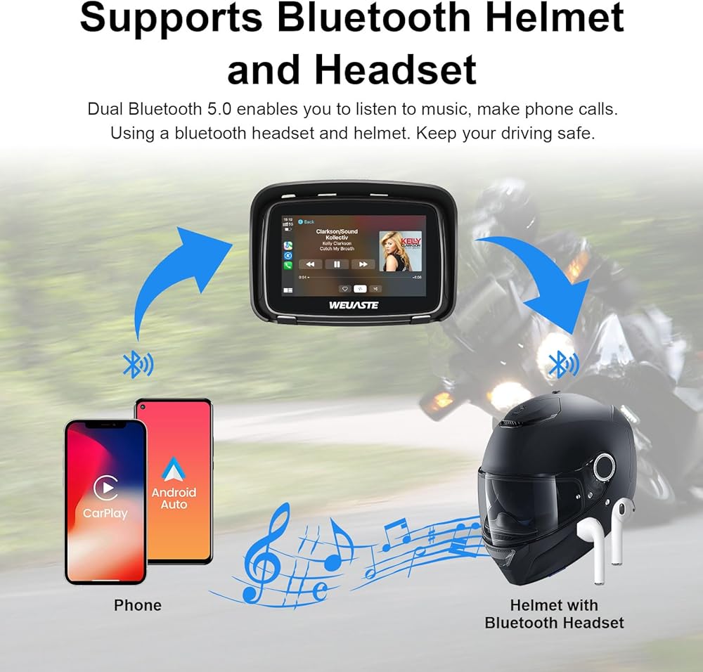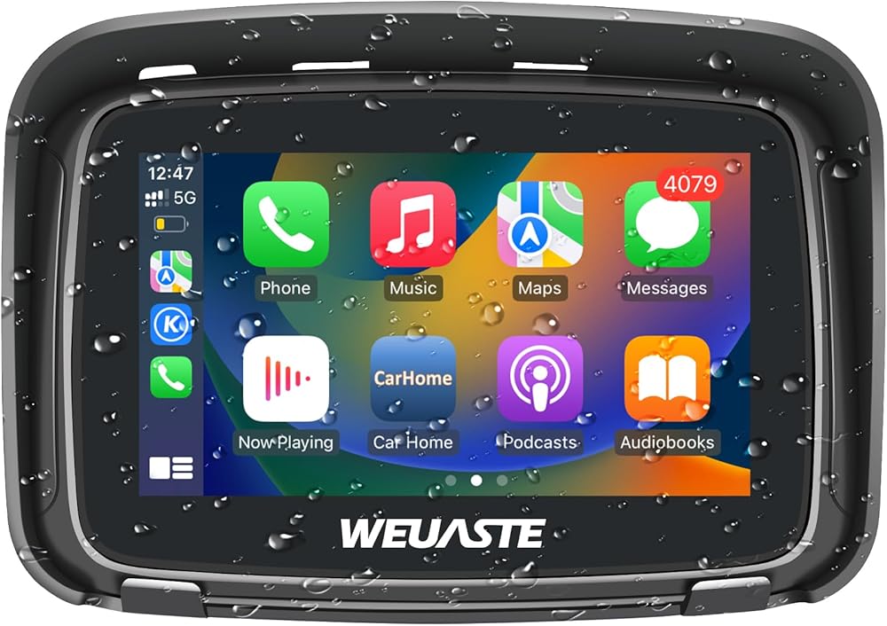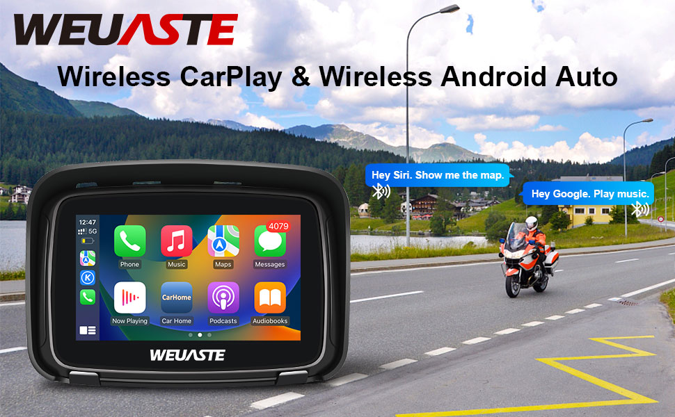 شاشة تشغيل سيارة Apple المحمولة من WEUASTE للدراجات النارية، Apple CarPlay اللاسلكي وAndroid Auto للدراجات النارية، ملاحة GPS Carplay للدراجات النارية، شاشة لمس مقاومة للماء 5 بوصات، بلوتوث مزدوج، دعم Siri