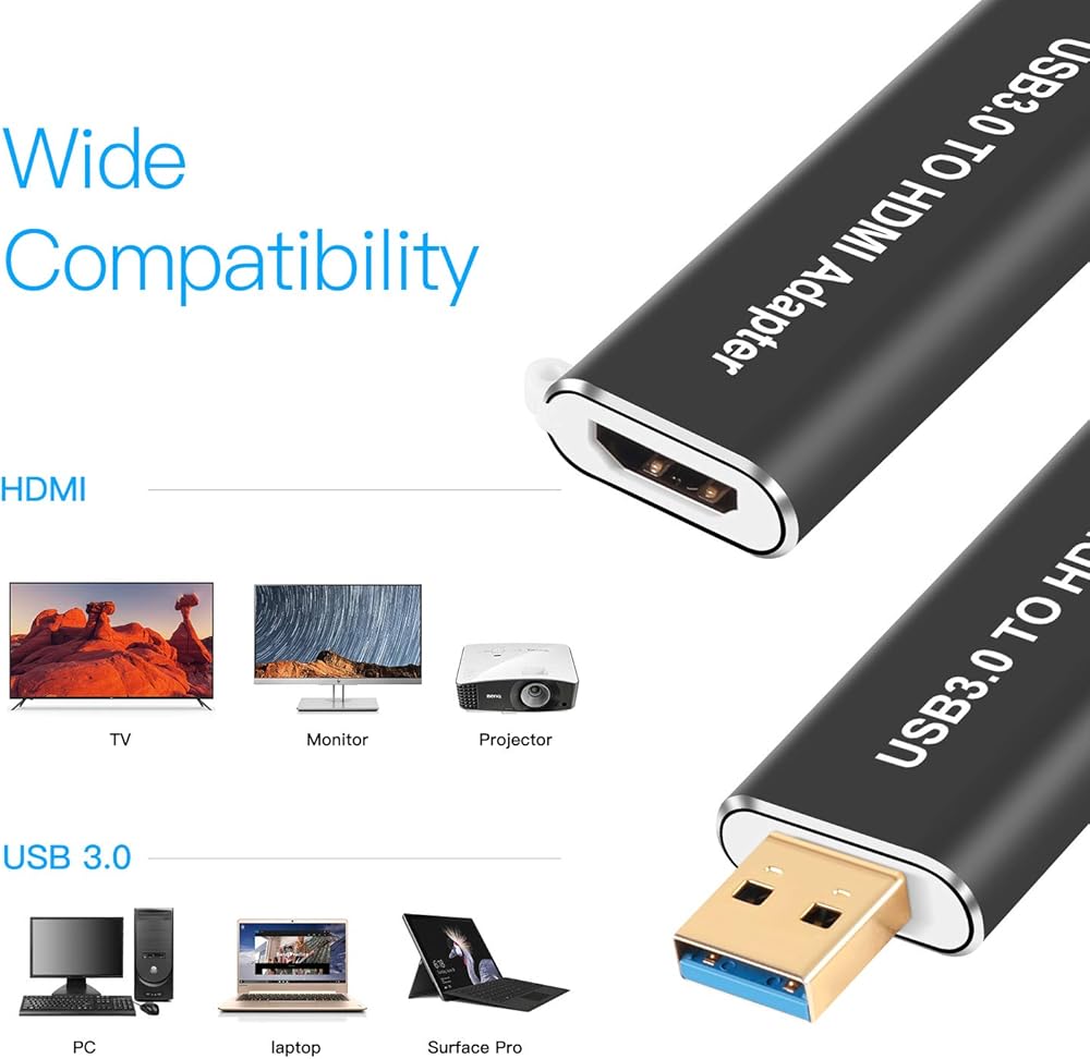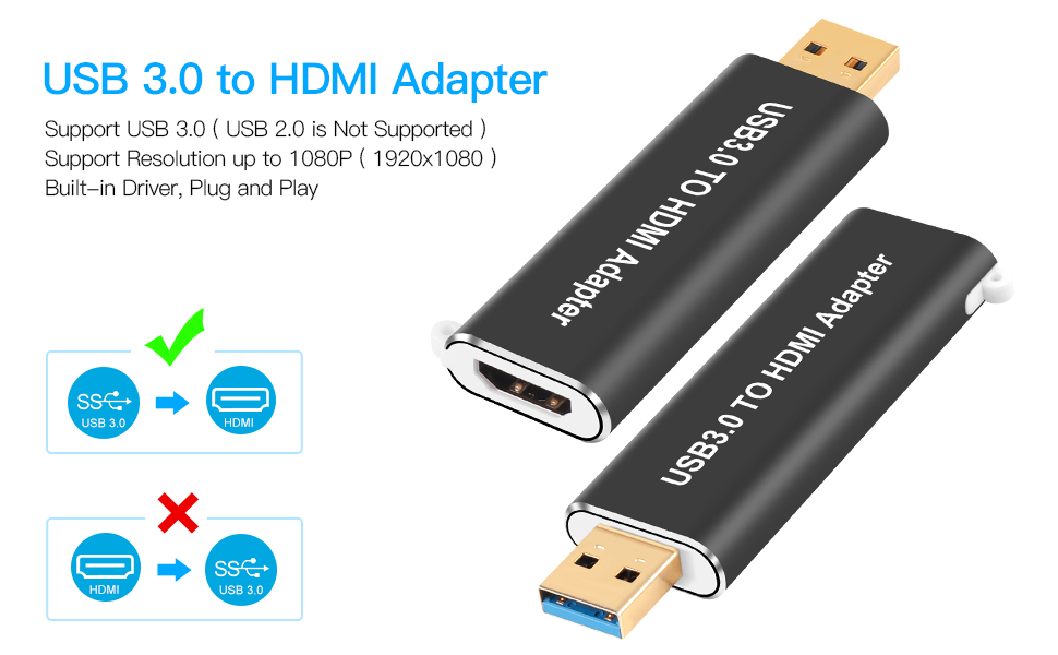 🎈محول USB 3.0 إلى HDMI: يمكن توصيل محول USB 3.0 إلى HDMI بجهاز HDTV أو شاشة أو جهاز عرض مع واجهة HDMI من خلال واجهة USB 3.0 للكمبيوتر المحمول. (إنها ليست بطاقة التقاط ولا يمكن نقلها من HDMI إلى USB 3.0)