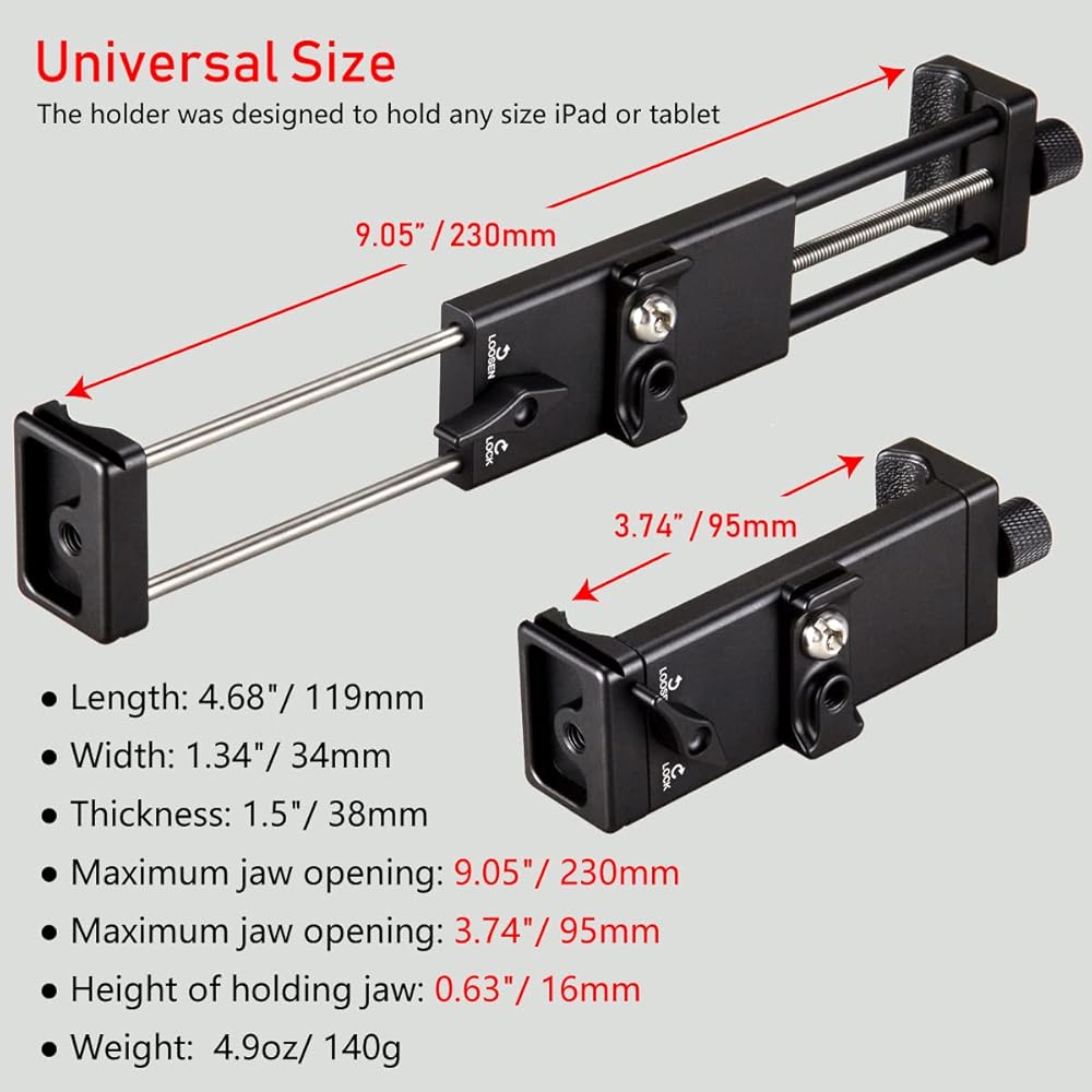 【يناسب أي ايباد أو تابلت】: يمتد من 3.75 انش حتى 9.05 انش ليناسب أي ايباد أو تابلت بما في ذلك ايباد برو 12.9 و10.5 و9.7 واير ميني وسيرفس برو وسامسونج جالكسي تاب وتابلت جالكسي وأكثر من ذلك. حامل تابلت اوليت ميت وحامل ايباد ثلاثي القوائم!