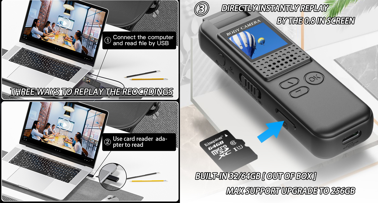 عمر البطارية 3-4 ساعات/32 جيجابايت وطريقتان لإعادة التشغيل: كاميرا الجسم مزودة ببطارية قابلة لإعادة الشحن بقدرة 800 مللي أمبير في الساعة، والتي يمكن أن تدوم ما يقرب من 3-4 ساعات عمل، وتدعم أيضًا تسجيل الفيديو على مدار الساعة طوال أيام الأسبوع عند الاتصال بالجهاز. بنك الطاقة/الطاقة، يساعدك على مراقبة كل مكان. ①تحتوي كاميرات الجسم لدينا على بطاقة مدمجة بسعة 32 جيجابايت، لدعم حفظ التسجيل لفترة طويلة ويتم التعرف عليها بواسطة الهواتف المحمولة/أجهزة الكمبيوتر المحمولة/الكمبيوتر الشخصي لإعادة التشغيل. ②إعادة التشغيل على الشاشة. علاوة على ذلك، يمكنك إغلاق الشاشة بمفتاح واحد لتوفير عمر البطارية.