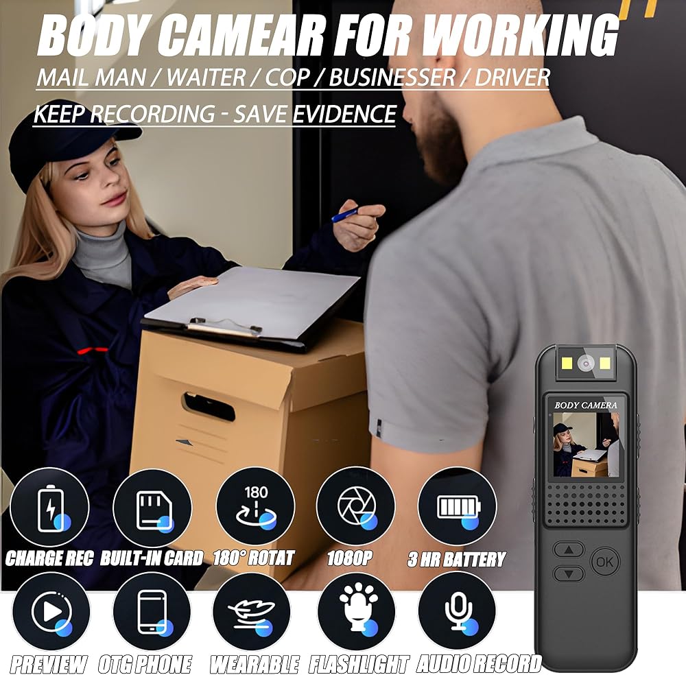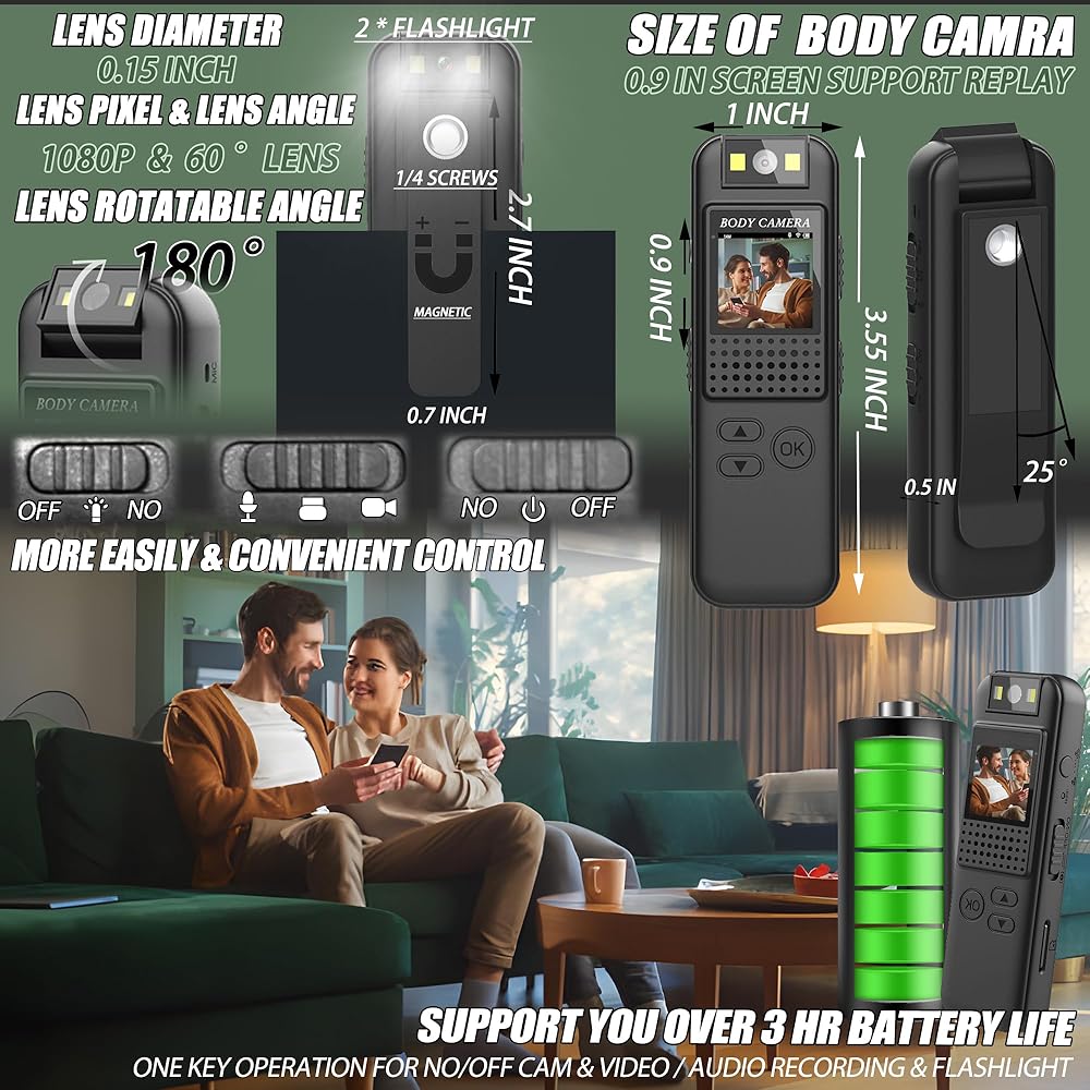 【شاشة LCD صغيرة قوية لكاميرا الجسم مقاس 0.9 بوصة】يمكن إعادة تشغيل كاميرا الجسم مع تسجيل 1080 بكسل من خلال شاشة LED عالية الجودة مقاس 0.9 بوصة. تأكد من دقة زاوية التسجيل المباشر، وسهل إعادة تشغيل اللقطات وحذفها على الفور بدون كمبيوتر محمول/ الهاتف الخليوي / الكمبيوتر الشخصي. قائمة مفصلة لتتمكن من التبديل، بحيث يسهل التحكم في كاميرا الجسم. توفر شاشة مقلوبة بزاوية 180 درجة تبديل الوضع على الفور [بدون تأخير]، ودعم عرض الطاقة، والتحكم في طول التسجيل الحلقي، وضبط الطابع الزمني، وإعادة ضبط الكاميرا بسرعة .