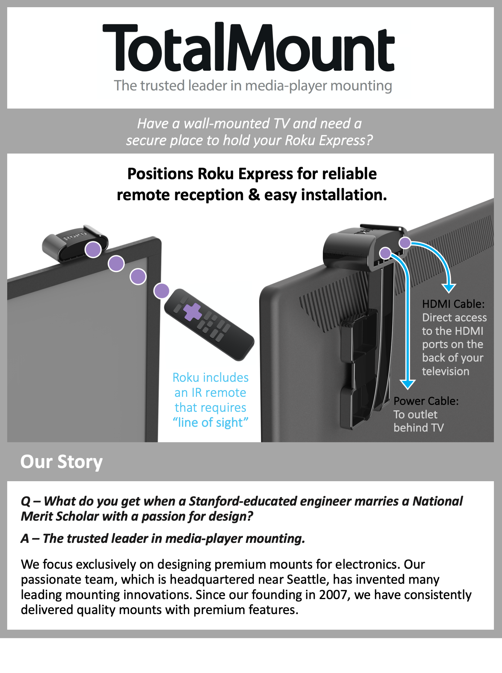غالبًا ما يتساءل الأشخاص الذين لديهم تلفزيون مثبت على الحائط عن مكان وضع روكو الجديد. أحد الخيارات هو توصيل كابل HDMI عبر الحائط إلى مركز ترفيهي، ولكن هذا الخيار مدمر للغاية ويستغرق وقتًا طويلاً للعديد من الأشخاص. خيار آخر هو محاولة موازنة روكو على حافة الموقد، مما قد يؤدي إلى اصطدام روكو بالأرض في المرة الأولى التي لا يكون فيها شخص ما حريصًا حول التلفزيون.