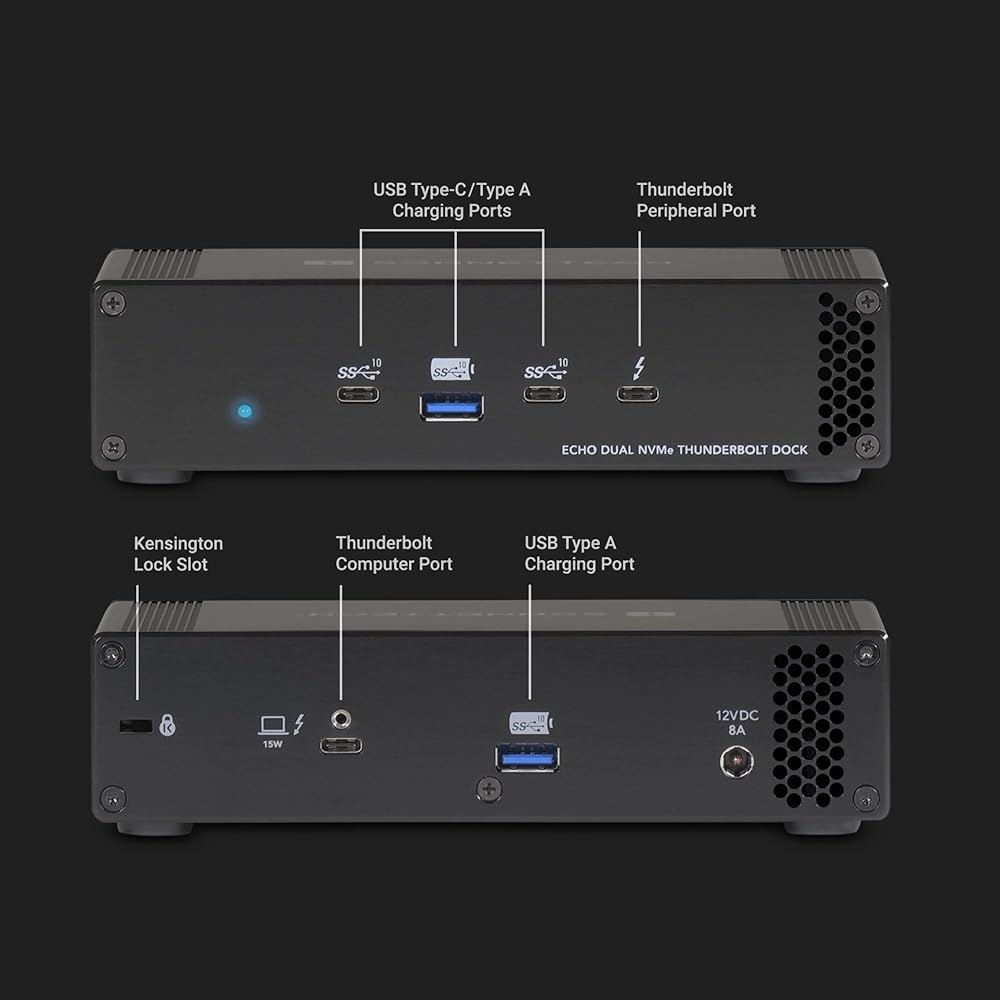 قاعدة ثاندربولت مزدوجة الذاكرة المستديمة من ايكو ، قاعدة ثاندربولت 40 جيجابايت في الثانية مع توسيع تخزين داخلي عالي الأداء. أضف ما يصل إلى 16 تيرابايت من تخزين SSD مساحة تخزين SSD كبيرة تلبي راحة قاعدة سطح المكتب. تدعم فتحات الذاكرة المستديمة المزدوجة توسيع التخزين الداخلي عالي الأداء. يمكنك نقل البيانات والوصول إليها في ثوانٍ، وتخزين الملفات الكبيرة ومكتبات الوسائط دون عناء. توفر المنافذ الطرفية المريحة والسريعة الاتصال والشحن لأجهزة ثاندربولت وUSB الخاصة بك.
