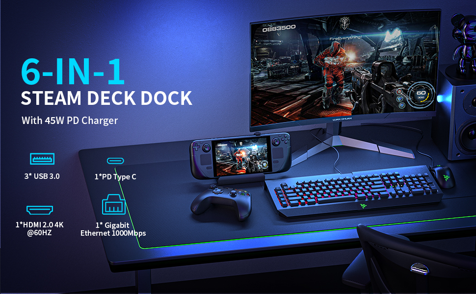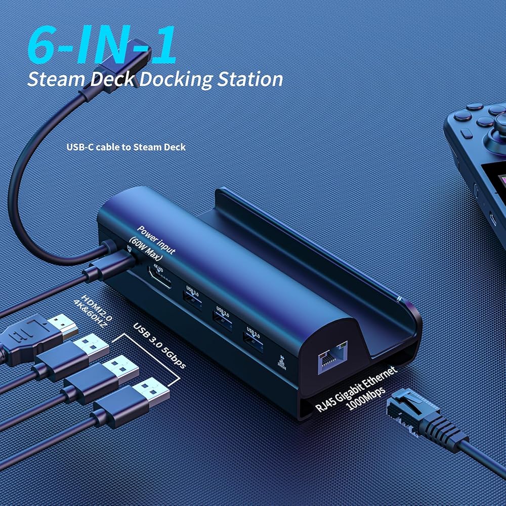 منصة ستيم ديك 6 في 1 مع شاحن 45 واط، HDMI 2.0 4K عند 60 هرتز، جيجابت ايثرنت 1000 ميجابت في الثانية، 3 USB-A 3.0 ومنفذ USB-C PD متوافق مع ستيم ديك