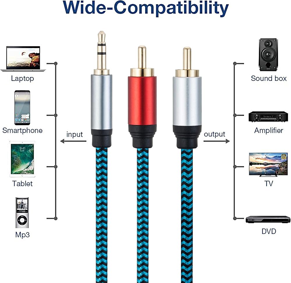 يعد كابل التصحيح الاستريو مقاس 3.5 مم إلى 2 RCA (يمين/يسار) مثاليًا لتوصيل قابس 3.5 مم بمقبس سماعة الرأس بجهازك أو الكمبيوتر و2 RCA's إلى المدخلات المساعدة اليسرى واليمنى على نظام الصوت الخاص بك. موصل 3.5 مم لـ صوت نقي وواضح مع الحد الأدنى من فقدان الإشارة