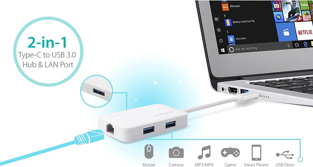 محول يو اس بي من النوع سي إلى يو اس بي 3.0 ومنفذ جيجابت من اديماكس، 3 منافذ يو اس بي 3.0، لماك بوك 2017، كروم بوك بكسل، جالكسي اس 8/ اس 8+ وما بعده (EU-4308)
