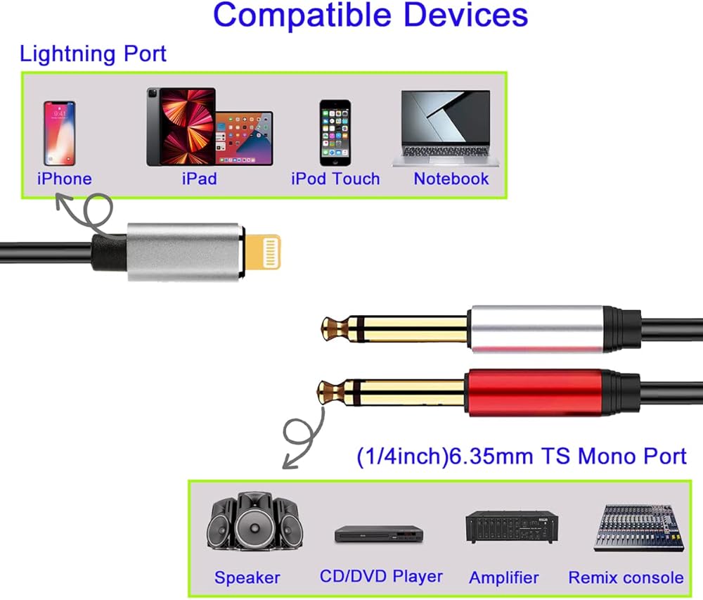 【Suitable for the scene】:The IOS to 1/4'' audio cable is Especially suitable for recording studios or live performances!Easy to use, stable connection.The lightnning to 1/4 TS MONO cable is total 6.6feet, Long enough for normal use between terminal devices like the Guitars/audio mixers and your mobile device.