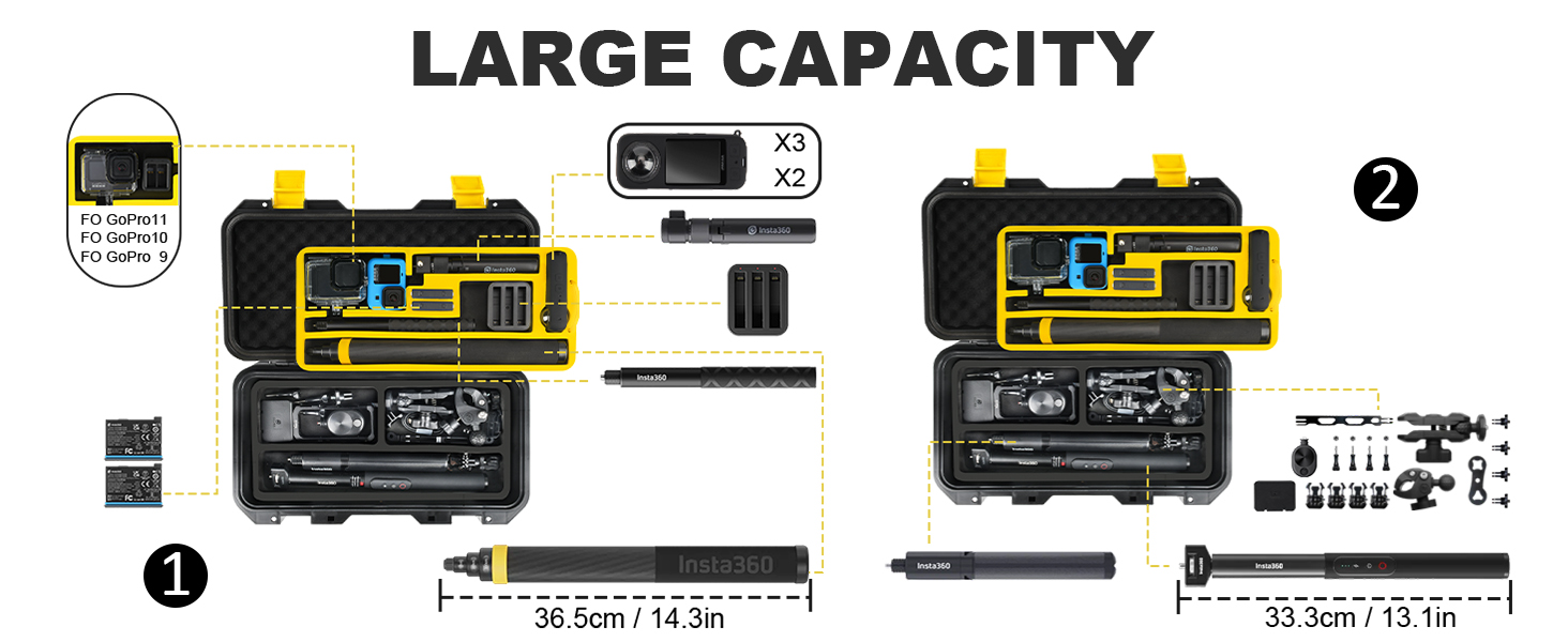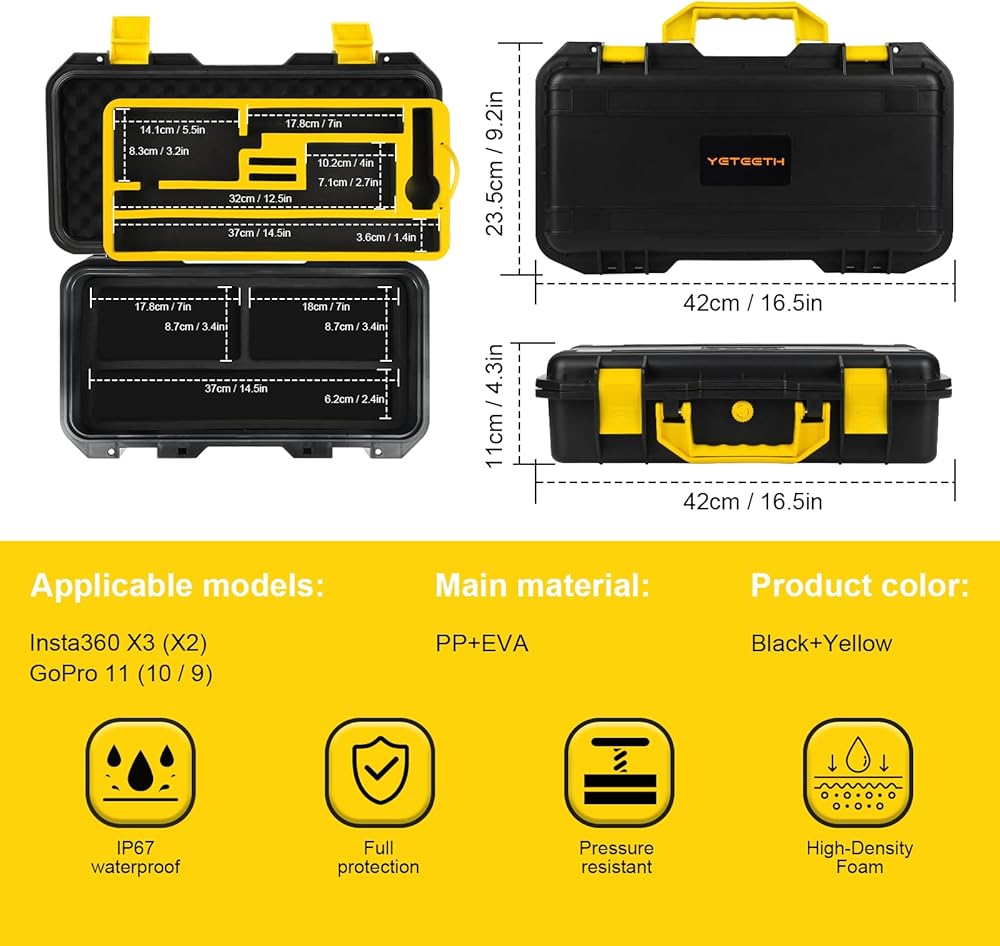 【آمنة ومتينة】حافظة انستا 360 X3 مصنوعة من مادة البولي بروبيلين الموثوقة، يمكن أن يتحمل الغلاف الخارجي تأثير 5000 باوند (وزن السيارة تقريبًا). يتم استخدام أشرطة مطاطية مانعة للتسرب حول المفاصل الموجودة في الصندوق لضمان مستوى مقاومة الماء والغبار لحافظة انستا 360 X3. تضمن هذه الحافظة الحماية الكاملة لجهاز انستا 360 X3 وملحقاتها.
