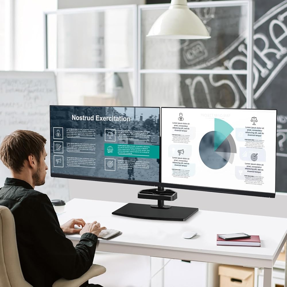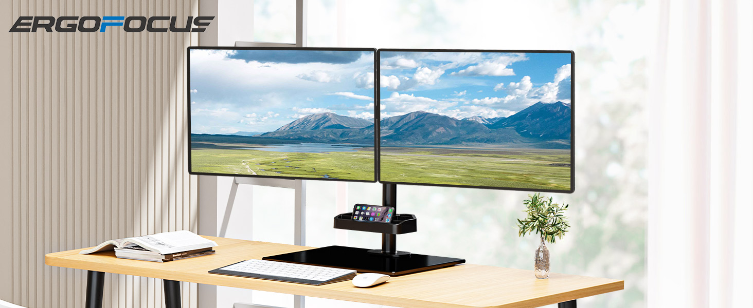 حامل شاشة مزدوج ErgoFocus لشاشتي كمبيوتر حتى 27 بوصة، حامل شاشة قائم بذاته يحمل بحد أقصى 17.6 رطل، حامل شاشة مكتب مع قاعدة من الزجاج المقسى ورف تخزين VESA Mount 75x75/100x100