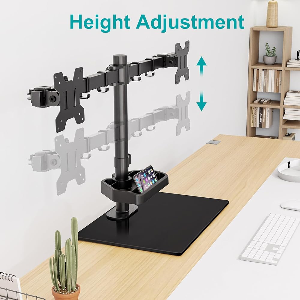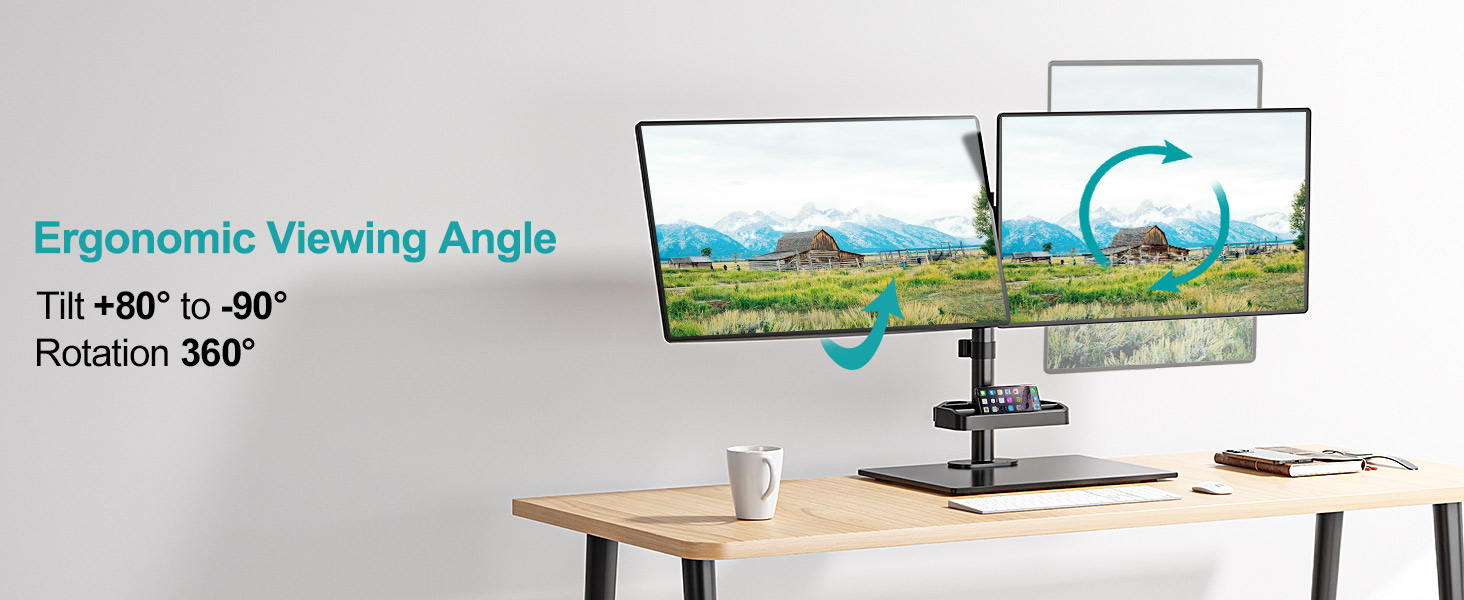 Ergonomic View Angle - This double monitor stand offers +80°/- 90° tilt, 360° rotation, +90° swivel for the arms. Monitors can be placed in portrait or landscape positions easily. The pole can adjust height up to 16.4" to fit different sitting or standing positions