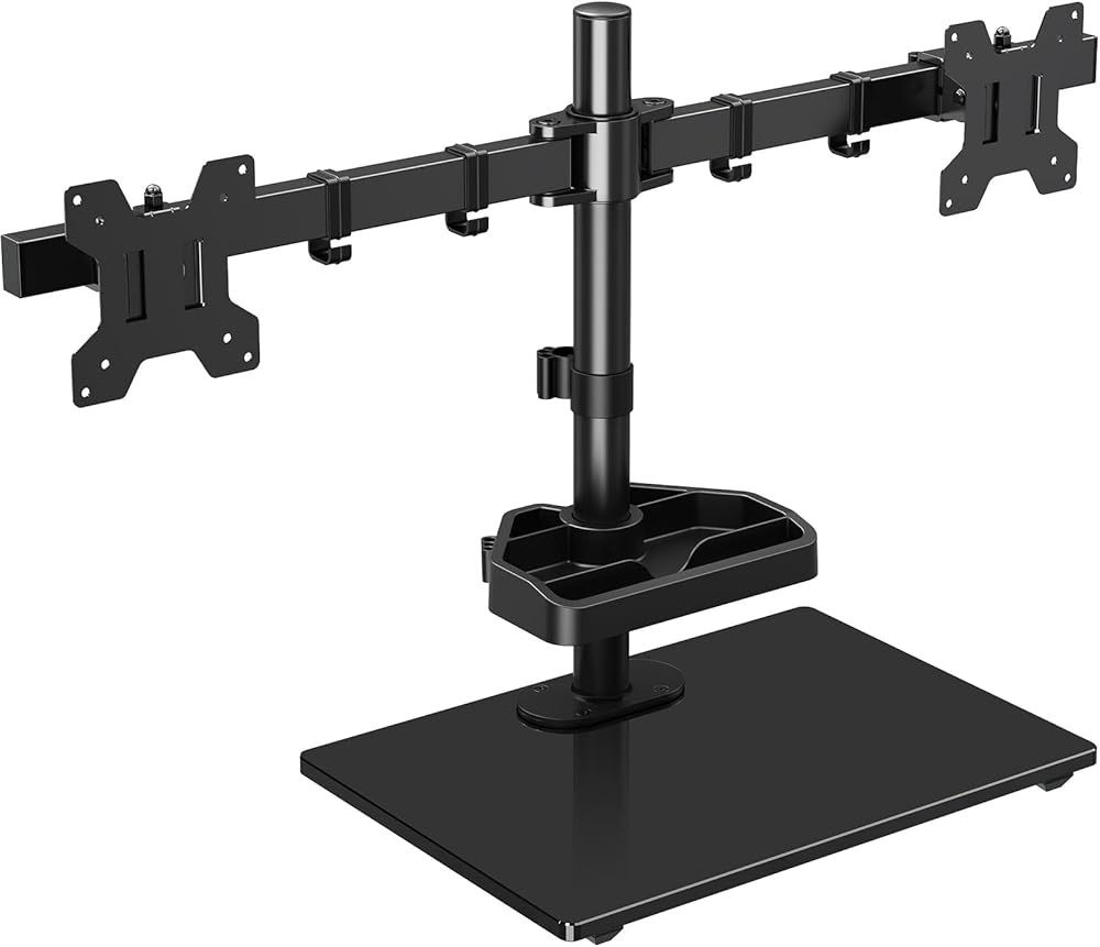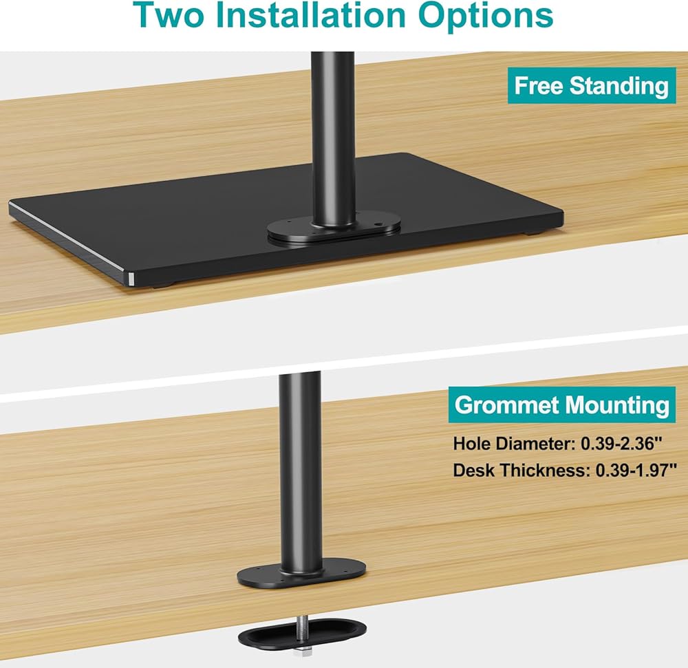 Sturdy Dual Monitor Stand - Free-standing design with heavy-duty tempered glass base allows for increased flexibility and can be used in spaces that do not allow a clamp or grommet mount. The size of tempered glass base is 15.7"x 11". You can also use the grommet base (suitable for desk thickness from 0.39" to 3.15"). The hole diameter should be 0.39" to 2.36"