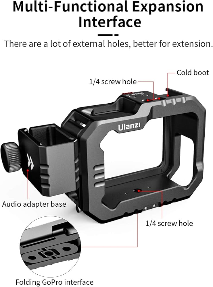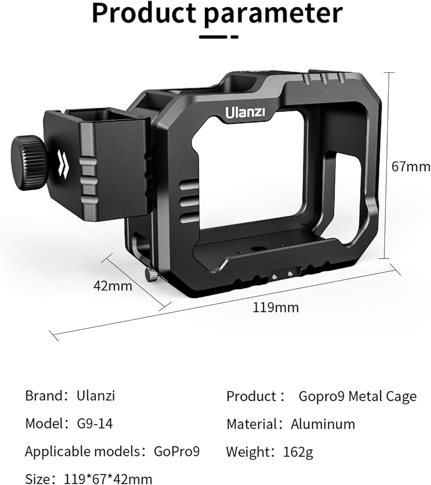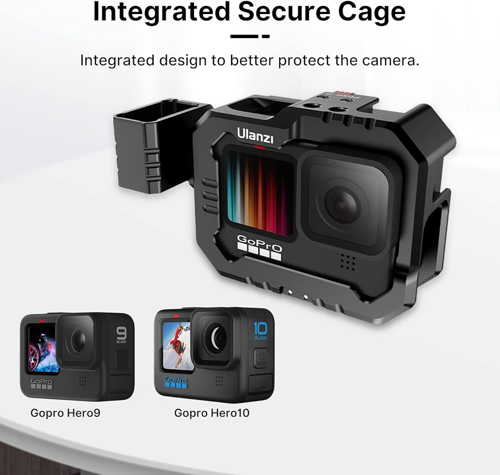 • جودة ممتازة للحماية الكاملة: هذا القفص عبارة عن خزان، يتمتع بحماية كاملة، جو برو مغلق بإحكام بالداخل. بشكل عام، القفص نفسه قوي للغاية ويتناسب بإحكام حول الكاميرا. إطار من الألومنيوم الصلب لكاميرا جو برو 9 باللون الأسود يساعد على تثبيت الملحقات بالميكروفون الخارجي بشكل جيد للغاية. بالتأكيد يجعل التصوير أكثر راحة، مع ربط كل شيء ولا شيء يتدلى (مثل محول ميكروفون جو برو)