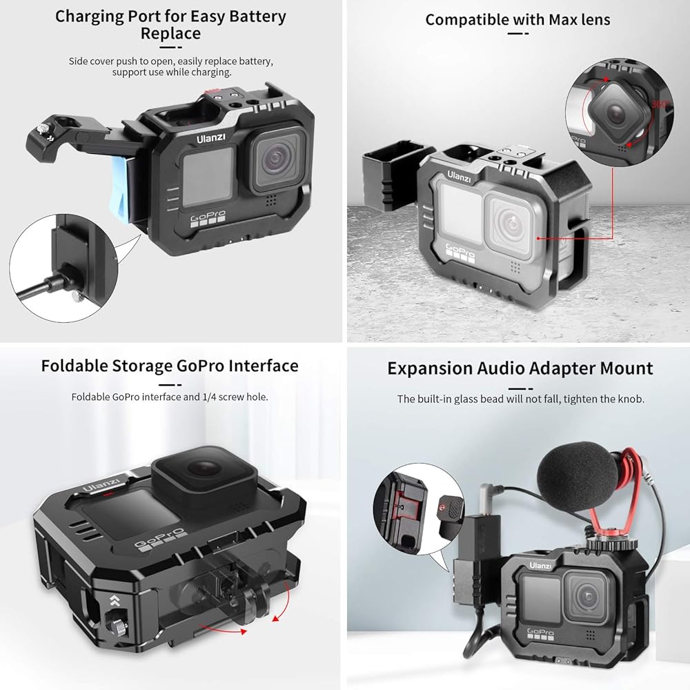 • يدعم الشحن أثناء الاستخدام، يوجد أيضًا فتحة صغيرة على الجانب للسماح بتوصيل كابل النوع سي. يحتوي على غطاء باب جانبي لتغطية البطارية وبطاقة مايكرو اس دي التي تعرض المنفذ لتوصيل الميكروفون الخارجي، لا مزيد من القلق بشأن سقوط البطارية عند توصيل محول الميكروفون، إعداد مثالي لمدونات الفيديو أو تسجيل المغامرات
