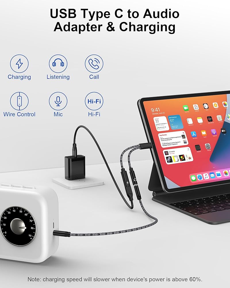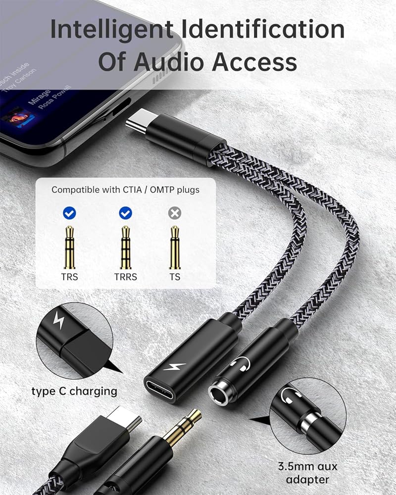 A3: لا، تم تصميم محول سماعة الرأس usb c مع الشحن لبث الصوت المتزامن والشحن السريع PD. لن يؤثر الاستماع إلى الموسيقى على سرعة الشحن.