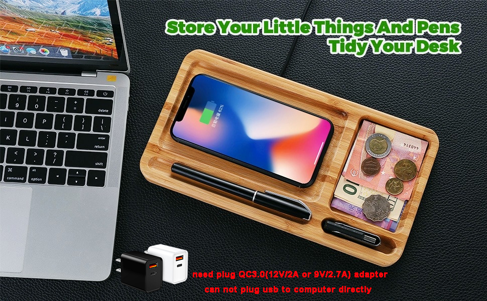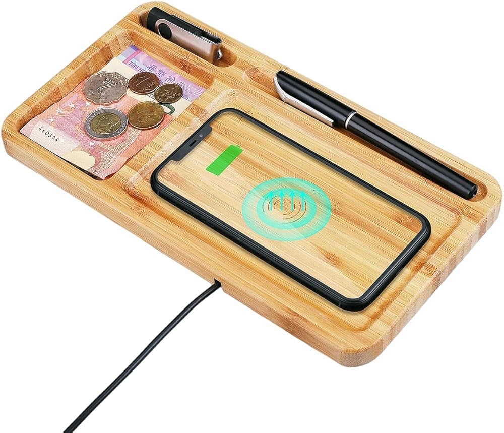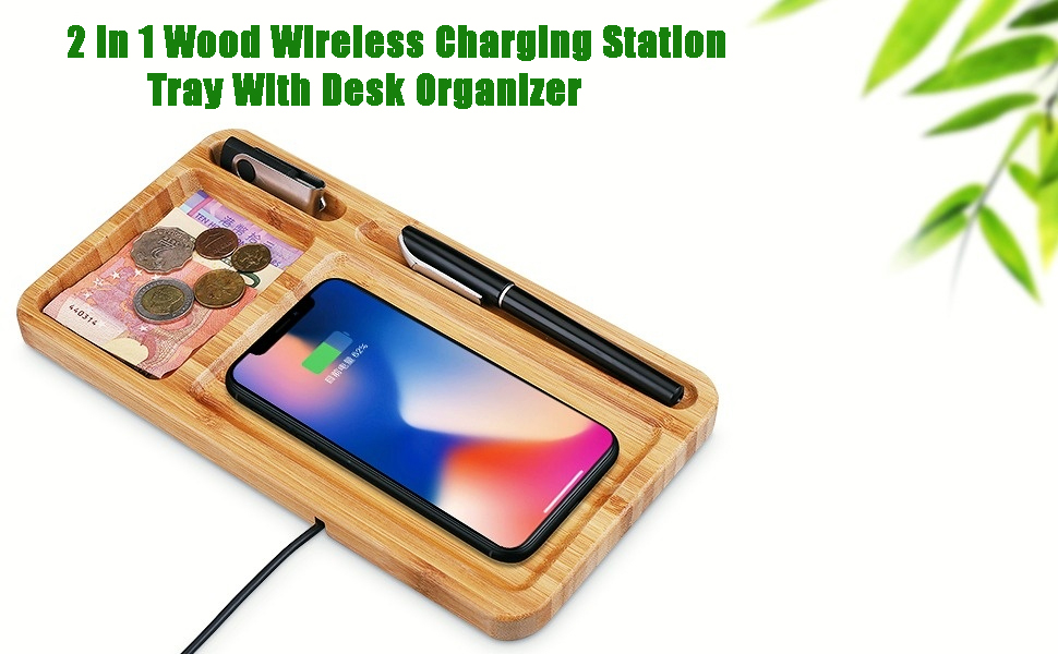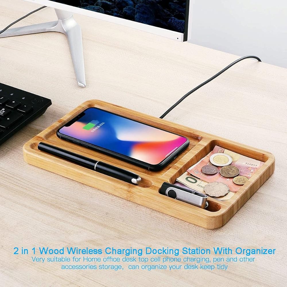 【حامل شحن وتخزين لاسلكي 2 في 1】قاعدة شحن لاسلكية للهاتف الخلوي ومنظم تخزين من خشب الخيزران الطبيعي، دع مكتبك يبقى مرتبًا، يشحن هاتفك لاسلكيًا بسرعة، إنه هدية مثالية لأصدقائك وعائلتك.