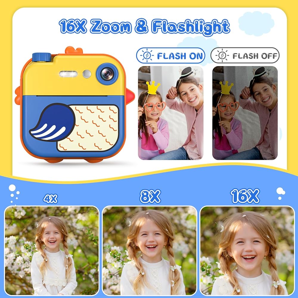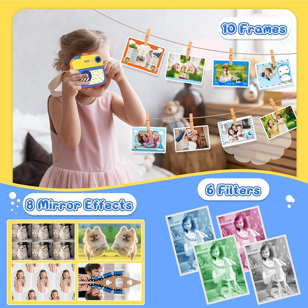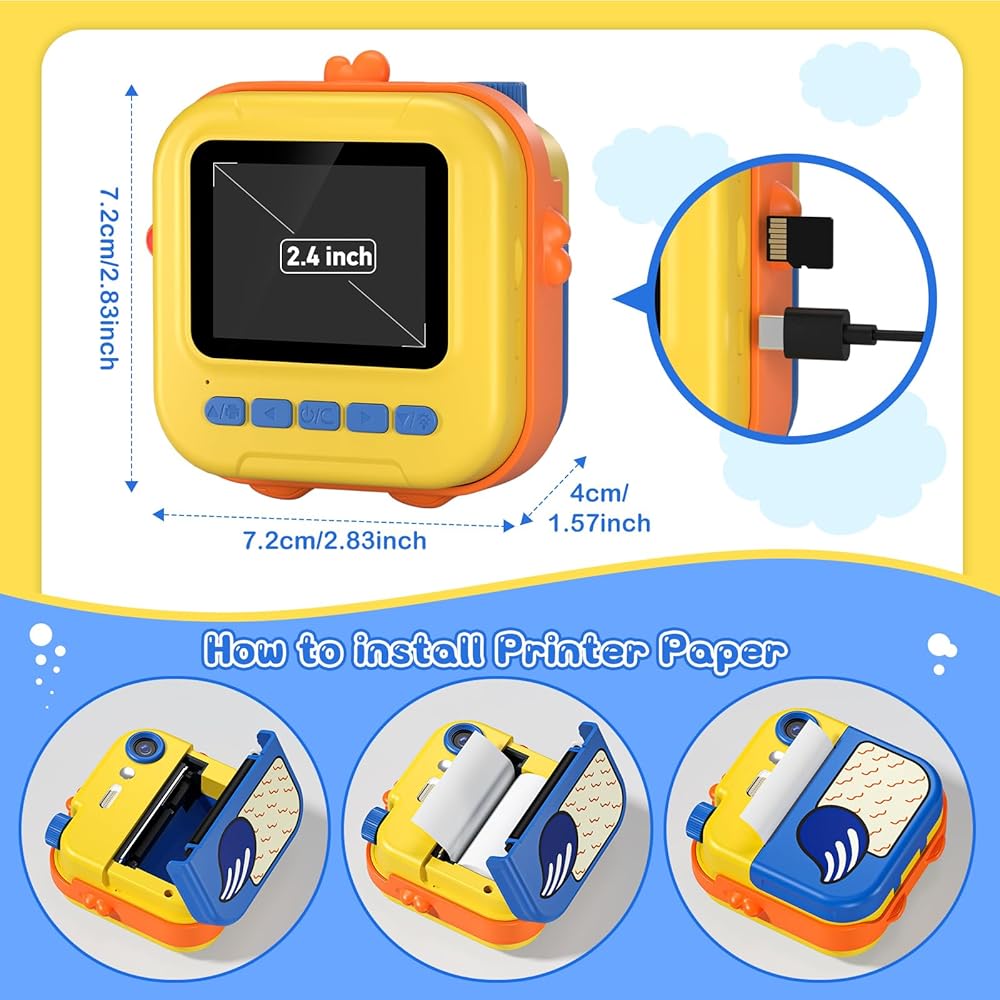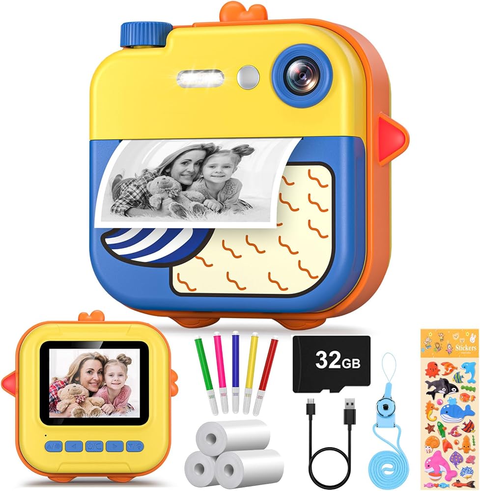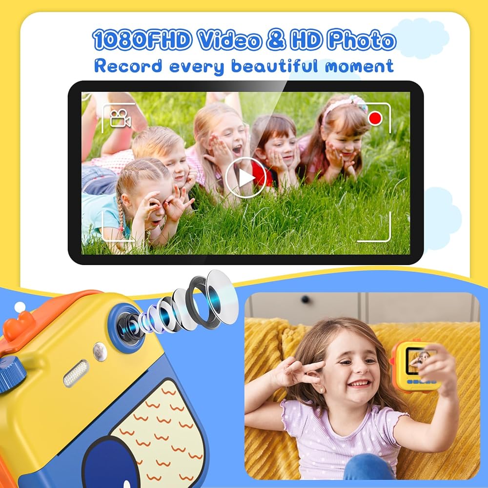 طباعة فورية لكاميرا الأطفال - كاميرا فيديو رقمية فورية بدقة 1080 بكسل للأطفال، هدايا عيد الميلاد للفتيات والأولاد من سن 3 إلى 12 عامًا، كاميرات للأطفال الصغار مع 3 لفات بدون ورق طباعة حبر وبطاقة SD 32 جرام - أصفر